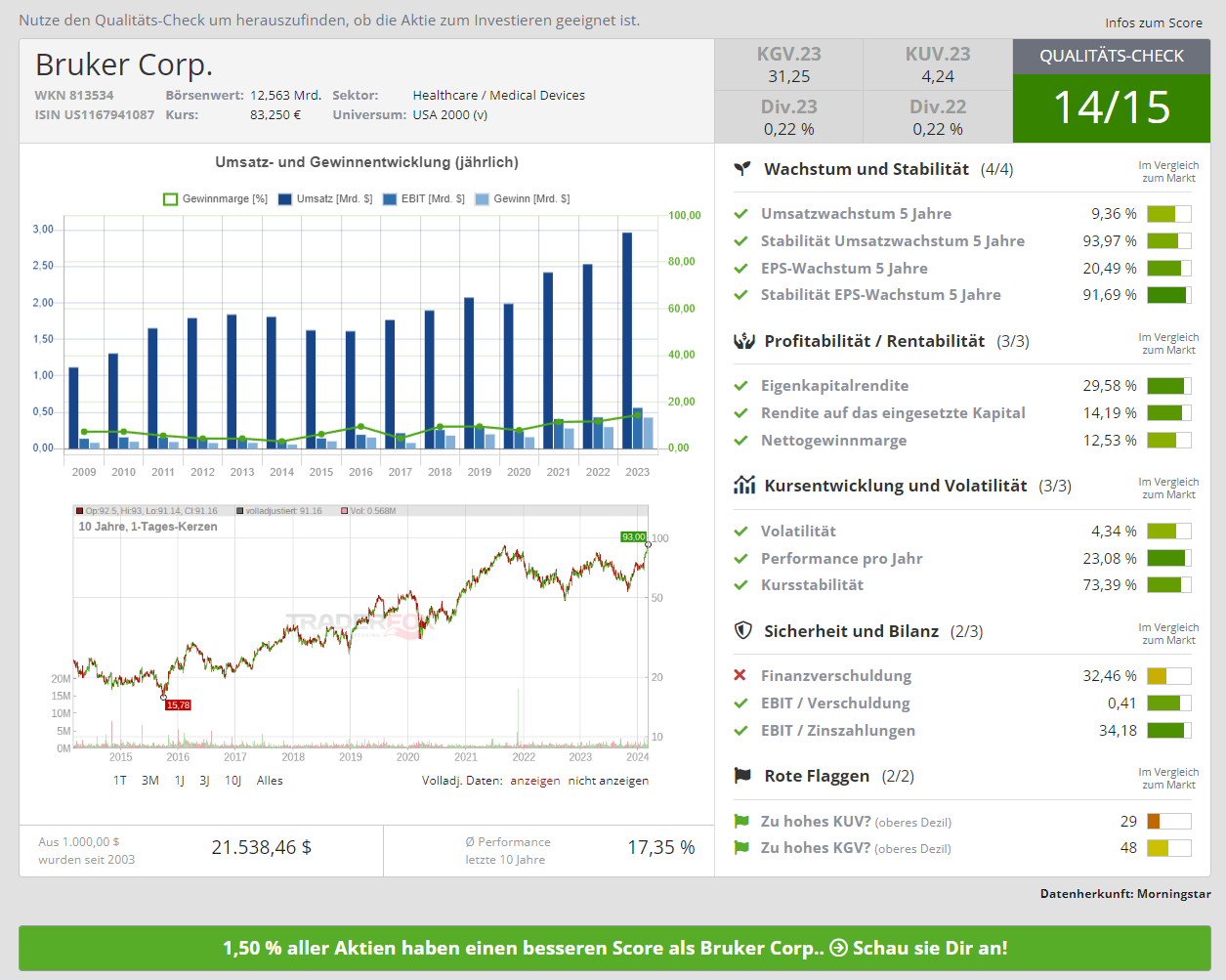 No.Skill März 9, 2024 · bearbeitet März 9, 2024 von No.Skill Hallo liebes Forum, nach langem Mitlesen will ich hier mal meine erste Aktie vorstellen, bei der ich meine das sie es wert ist Die Aktie ist mir bei meinen Streifzügen durchs Netz sehr positiv aufgefallen. WKN: 813534 ISIN: US1167941087 SYMBOL: BKD Hompage: www.bruker.com https://de.wikipedia.org/wiki/Bruker Bruker Corporation Kurz: "Brukers differenzierte hochwertige Life-Science-Forschungs- und Diagnoselösungen versetzen Wissenschaftler in die Lage, bahnbrechende Entdeckungen zu machen und neue Anwendungen zu entwickeln, die die Lebensqualität des Menschen verbessern." Also vielleicht eine kleine Mischung aus Siemens Healthineers, Keyence Corporation und KLA? Wenn man sich durch das Produktportfolio liest, sehr beeindruckend in welchen Bereichen sie überall Anwendung finden. Die Story ist echt unglaublich, was dieses Unternehmen herstellt und die Geschichte der Entstehung, das hat mich sehr begeistert. Die fundamentalen Daten sprechen nach meiner Einschätzung für sich, laut TraderFox Aktien-Terminal und marketscreener.com ein kleines feines Unternehmen. Da ich mein eigenes Depot in Richtung ETF umbaue, werde ich voraussichtlich nicht einsteigen, wollte den Wert dennoch gerne vorstellen. Eventuell findet Bruker Corporation ja so einen Aktien "Liebhaber" der sie in sein Musterdepot aufnimmt . Viel Erfolg und grüße No.Skill Diesen Beitrag teilen Link zum Beitrag