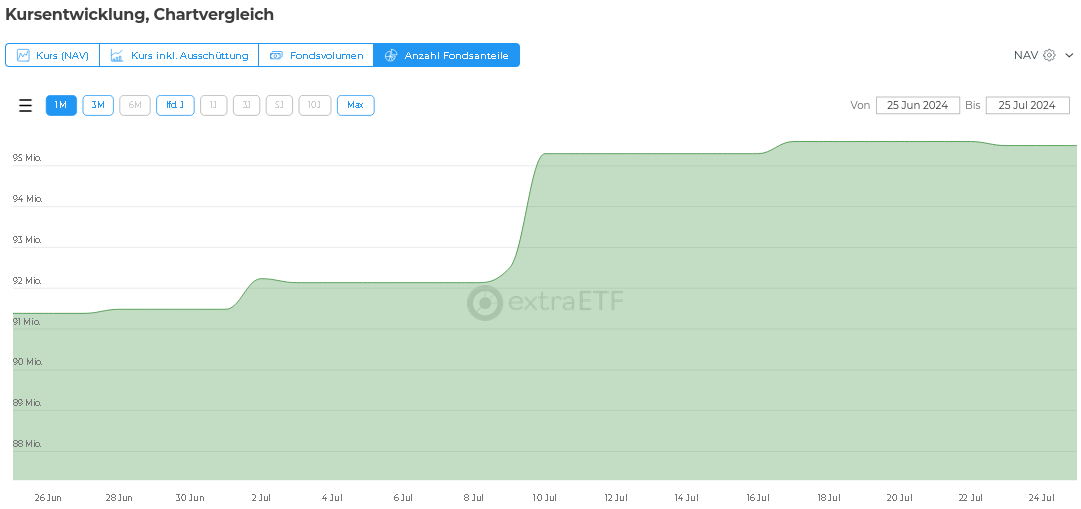 Na ja, Vorsicht mit solchen Aussagen... Bei extraETF kann man sich ein Diagramm mit der Anzahl der Fondsanteile anzeigen lassen: Ich meine zu erkennen, dass es am 23.07. doch ganz leicht zurückgeht...