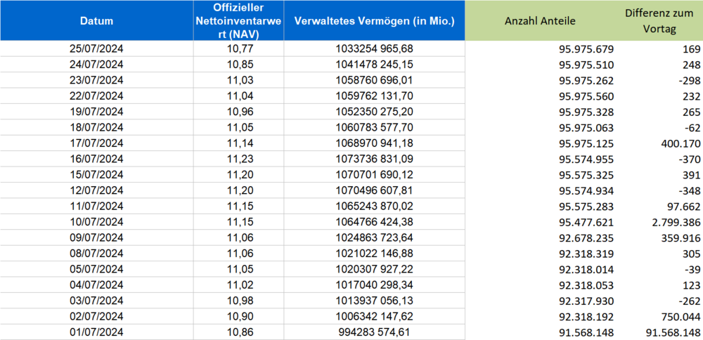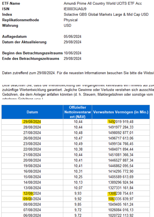 Ich würde den Daten von extraETF nun nicht so viel Glauben schenken, da sind oft viele Fehler drin. Auf der Amundi-Homepage kann man sich direkt eine Excel-Tabelle mit den täglichen NAV- und AuM-Werten herunterladen. Die Anzahl der Anteile stehen da nicht drin, daher leite ich sie mir mit einer Division ab. Da der NAV nur mit zwei Nachkommastellen angegeben wird, enstehen hier Rundungsfehler, die direkt ca. 100k Anteile ausmachen können. Daher sind die -298 Anteile am 23.7. auch als "keine Änderung im Rahmen der Rundungsfehler" zu werten.