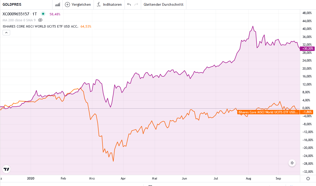Ich habe seit Jahren Gold im Portfolio und fühle mich wohl damit. Aktuell stimmt auch die Rendite. Sie ist seit 2018 deutlich besser als bei meinem All World. Dafür kaufte ich mir aber nicht das physische Edelmetall. Es ist für mich eher eine psychologische Stütze, wenn es am Aktienmarkt mal wieder kracht. Der Vergleich Anzug zu einer Unze Gold ist vielleicht etwas plakativ, aber doch einprägsam. Vor 500 Jahren, vor 200 Jahren, vor 50 Jahren und heute bekam/bekommt man in jedem entwickelten Land für eine Unze Gold einen guten Anzug. Währungen kommen und gehen. Aktien werden Gold als Anlageklasse trotzdem immer schlagen, aber es hat trotzdem was beruhigendes, dass man damit zumindest langfristig die Inflation ausgleichen kann und einen Notanker (versichert) zu Hause hat.