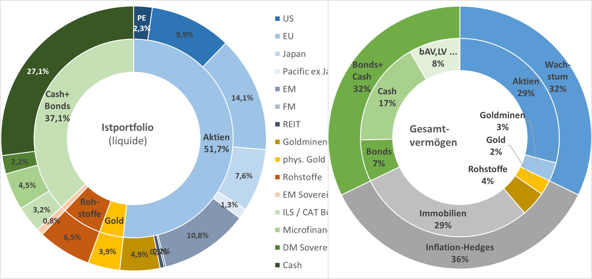 Gesamtvermögen = liquides Depot + Immobilien + Anwartschaften betriebl. Altervorsorge, kapitalbildende Lebensversicherungen und Riester nach Steuern (ohne Rentenansprüche und ohne künftige bewertete Arbeitskraft)