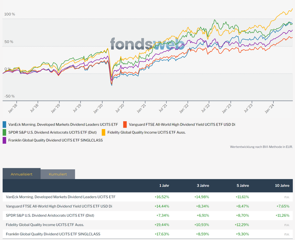 MartinB Juni 13, 2024 · bearbeitet Juni 13, 2024 von MartinB Es macht doch überhaupt keinen Sinn, einen Dividenden-ETF mit einem Welt-ETF zu vergleichen (Stichwort: Äpfel und Birnen). Hier mal ein Vergleich mit anderen bekannten Dividenden-ETF Der Fidelity Quality Income schneidet zwar am besten ab, ist aber für mich sowohl hinsichtlich Zusammensetzung (man schaue sich dort nur die Top Ten an) als auch Dividendenhöhe kein wirklicher Dividenden-ETF. Ich für meinen Teil bin jedenfalls erheblich in den VanEck investiert, vor allem, weil ich durch den Sitz des Fonds mir noch einen Teil des Solis faktisch spare (nach Überschreiten des Sparerfreibetrags natürlich). Diesen Beitrag teilen Link zum Beitrag