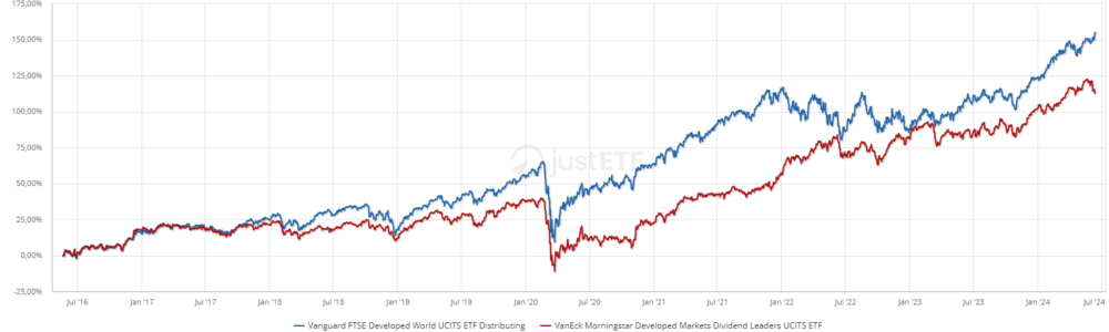 Behemoth Juni 14, 2024 · bearbeitet Juni 14, 2024 von Behemoth @Martin B: Vielen Dank für den sinnvollen Vergleich mit anderen Dividenden-ETF. Ein weiterer interessanter Dividenden-ETF ist für mich der Franklin Global Quality Dividend ETF, der derzeit aber auch schlechter als der VanEck abschneidet. @Schwachzocker: Ob die durchschnittliche Performance wirklich durch einen Welt-ETF abgebildet wird? Vergleiche mal den S&P 500 (+16%) mit dem S&P 500 Equal Weight (+1%) seit Jahresanfang. Es sind derzeit einzelne Growth-Aktien, die die Indizes nach oben ziehen. Entsprechen Equal Weight-Indizes nicht eher dem Durchschnitt? Es ist ja legitim, da mitzulaufen, und über ETF und Sparpläne alles Geld in Welt-ETF mit einer zunehmenden Konzentration dieser Growth-Aktien zu investieren. Hat seit 2008 hervorragend funktioniert. Aber der Hebel dieser Konzentration kann eben auch in die andere Richtung wirken. Der VanEck Morningstar Developed Markets Dividend Leaders ETF liegt bei +7,34% seit Jahresanfang, ohne dass er einen der Top10-Werte des Vanguard FTSE Developed World ETF enthält. Sind halt Äpfel und Birnen. Diesen Beitrag teilen Link zum Beitrag