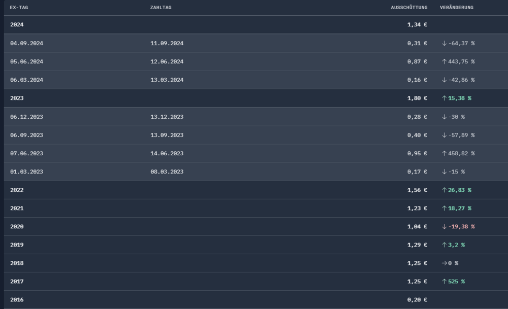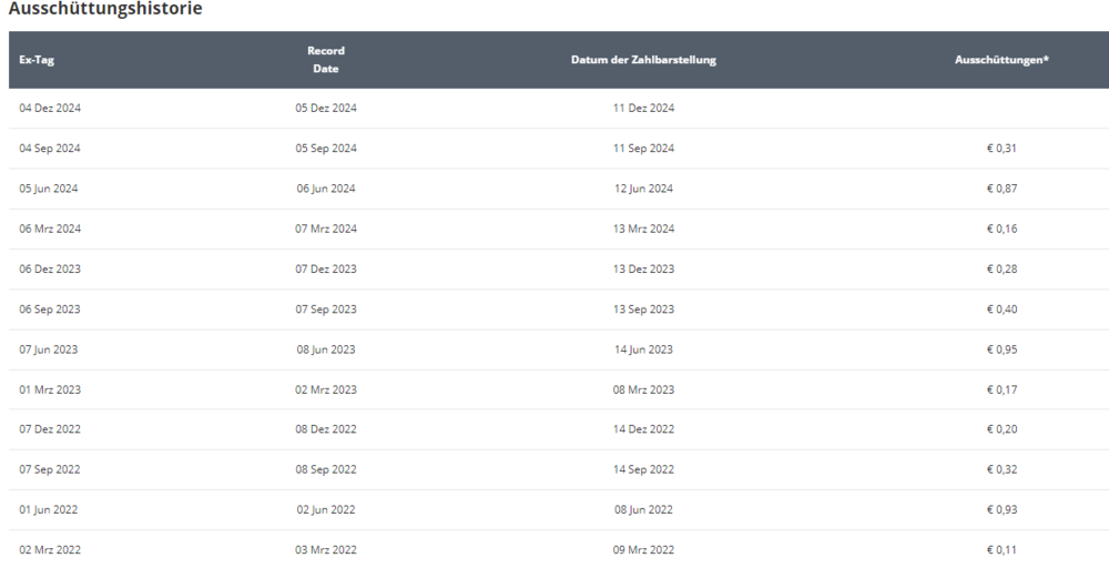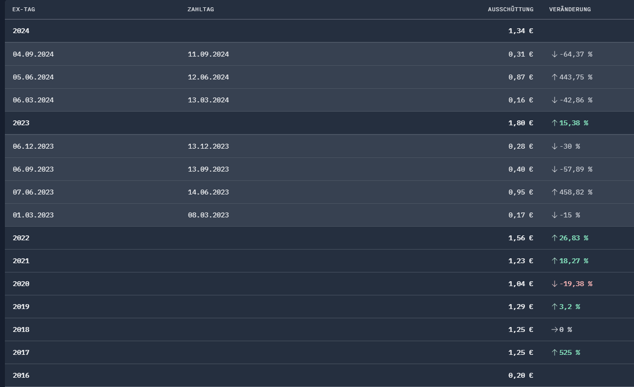 timk Dezember 5, 2024 Am 27.11.2024 um 12:33 von tibesti: Ausschüttungs-Ankündigung: 0,34 Euro (damit Erhöhung um 0,06 Euro gegenüber 4/23) EX-date: 4.12.24 Zahltag: 11.12.24 Gesamtauschüttung 2024: 1,69 Euro (-0,11 Euro (1,80) gegenüber 2023) Etwas mager dieses Jahr, wird hoffentlich 2025 wieder besser Diesen Beitrag teilen Link zum Beitrag