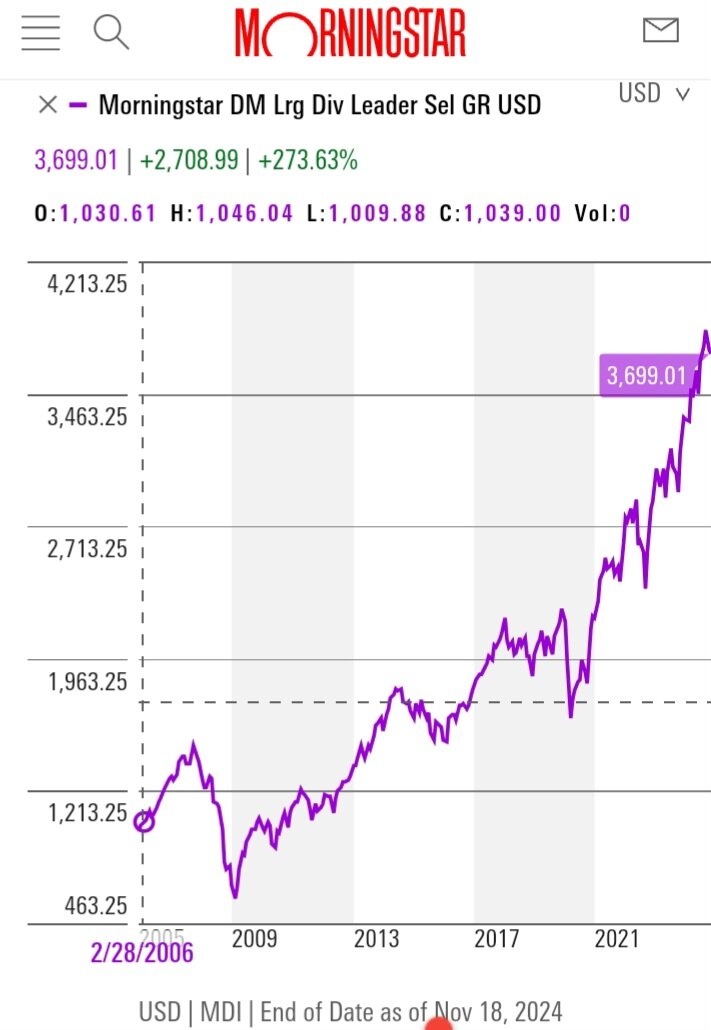 sedativ November 19, 2024 · bearbeitet November 21, 2024 von sedativ Am 19.11.2024 um 18:57 von BlindesHuhn88: Bedeutet das dass der vaneck den MSCi World outperformt hat? Nein. Der Morningstar Dividend Leaders Total Return Index startete am 31.12.2005 mit 1000 Punkten und hat seitdem 275% zugelegt. Der MSCI World Total Return hat hingegen im gleichen Zeitraum 350% zugelegt. Dennoch bemerkenswert für einen Dividendenindex mit z.Zt. nur 30% US- und 4% Techanteil. Diesen Beitrag teilen Link zum Beitrag