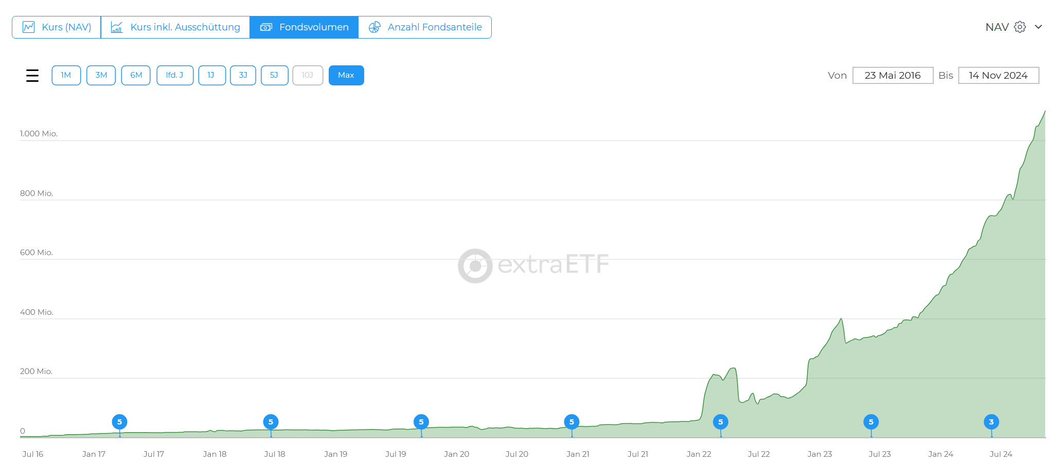 timk November 15, 2024 Aufgrund des lange Zeit relativ geringen Fondsvolumen hatte ich bedenken, ob der Fonds nicht irgendwann eingestellt wird. Aber seit gut einem Jahr hat das Volumen ordentlich zugelegt: Diesen Beitrag teilen Link zum Beitrag
