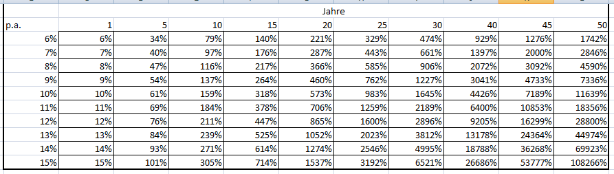 dev Juni 28, 2024 · bearbeitet Juni 28, 2024 von dev vor 18 Minuten von etherial: Wer aber täglich 1h Aktien analysiert hat die Zeit (und das damit verbundene Geld) verloren. Und das ist bei kleinen Kontoständen entscheidender als Prozentualer Zuwachs. Offensichtlich hast du dir die systematische Berechnung auch nicht angeschaut. Diesen Zeitaufwand sehe ich als sehr übertrieben an und wie du selbst erkannt hast, fällt dieser langfristig. Über 25 Jahre liegt zwischen 6% p.a. und 10% p.a. ein Faktor 3, da kann es sich lohnen frühzeitig den Weg mit der höheren Rendite einzuschlagen. Diesen Beitrag teilen Link zum Beitrag