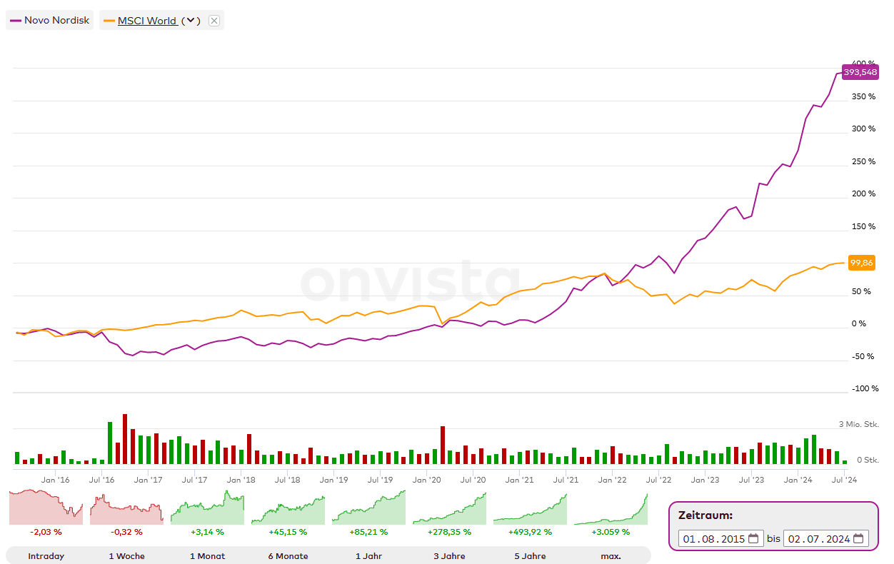 CorMaguire Juli 2, 2024 · bearbeitet Juli 2, 2024 von CorMaguire vor 1 Stunde von Bast: Zumindest diese These aus dem Artikel darf als bewiesen gelten:.... Aber damals (03/2017) war das Beispiel noch gut "Beispiel: Die Aktie des dänischen Pharmakonzerns Novo Nordisk war jahrelang eine der Topempfehlungen in Börsenbriefen und Anlegermagazinen. Das Unternehmen hatte als Weltmarktführer für Diabetesmedikamente seinen Altaktionären phänomenale Gewinne beschert. Doch Anlegern, die diese Aktie zum Höchstkurs im August 2015 gekauft haben, nutzt das wenig. Sie sind zurzeit mit rund 40 Prozent im Minus. Hätten sie stattdessen einen „langweiligen“ MSCI−World−ETF genommen, stünde ein rund 10-prozentiger Wertzuwachs zu Buche," Diesen Beitrag teilen Link zum Beitrag
