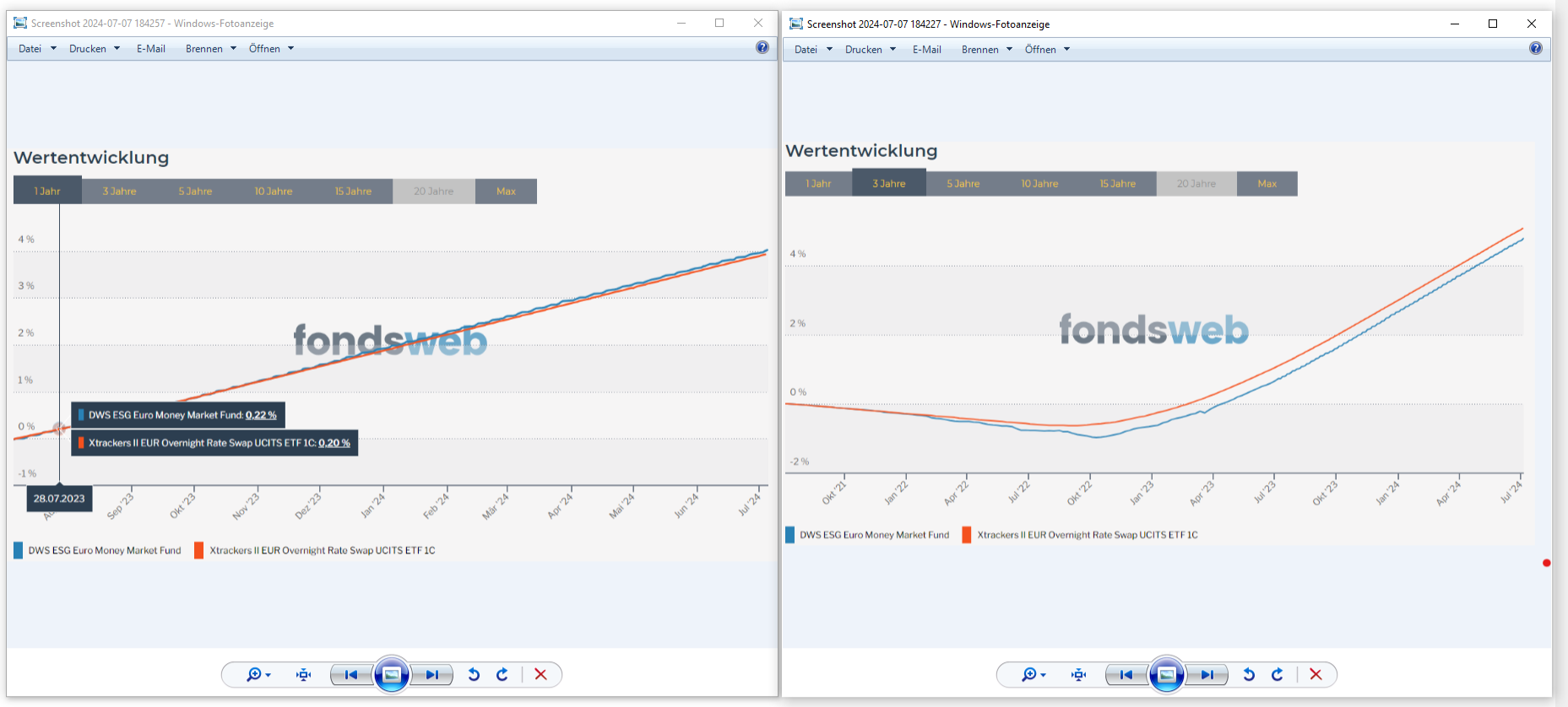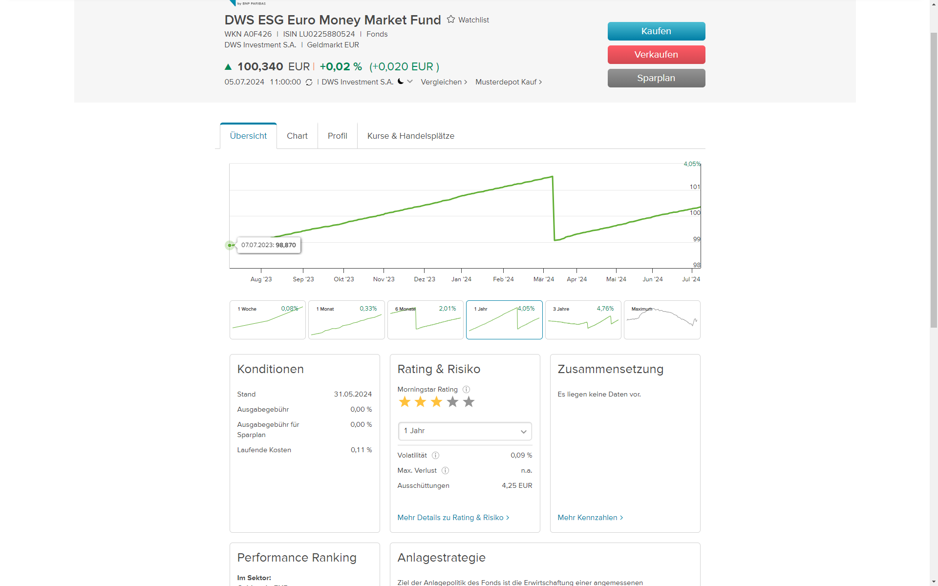 Taisel Juli 7, 2024 Also um zurück zum Topic zu kommen. Ich stelle gerade ziemlich verwundert fest, dass beim A0F426 eine TER von 0,17% im Kostenausweis angezeigt. Ausgewählt als Handelsplatz ist die Fondgesellschaft, dementsprechend fallen keine Ein- und Ausstiegskosten an. Dagegen ist die TER beim DBX0AN deutlich geringer, nämlich 0,10% (wg. den 0,95€ Ordergebühren aufgrund Neukundenbedingungen, die ab Oktober aber auslaufen werden) bzw. dann 0,12% bei Verkauf. Das macht zwischen Beiden pro Jahr ein TER-Unterschied von ca. 200€ aus. Der Unterschied würde sich aber ab Oktober mit dem Auslaufen der Consors-Neukundenbedingungen schmälern. Dann sind es beim DBX0AN nicht mehr 0,95€ pro Order fällig sondern, 4,95€ + 0,25%. Würde beim monatlichen Befüllen vom A0F426 bei mir ca. 10€ pro Monat bzw. 120€ im Jahr an Ordergebühren ausmachen. Ergo läge dann der TER-Unterschied nicht mehr bei 200€, sondern bei ~ 80€. Ist die Frage ob sich die 80€ mehr für A0F426 rentiert oder man doch lieber den DBX0AN nehmen sollte? Oder: Ich wechsele zu einem Neobroker (bspw. TradeRepublic) mit Ordergebühren von ~ 1€ und nehme dort den DBX0AN? Die TER-Ersparnis zum A0F426 bei der Consorsbank wären dann die vollen 200€ pro Jahr! Ja und die eigentlich Rendite vom A0F426 zum DBX0AN sollte man natürlich auch Beachtung schenken! Minimale Abweichungen machen bei 300k locker mal 200€ im Jahr aus! Für das letzte Jahr zumindest war laut dem fondsweb Chart der A0F426 kurz vor dem DBX0AN. Für die letzten drei Jahre war aber der DBX0AN deutlich vorne! Wie kommt das zu Stande? Wenn man davon ausgeht, dass in nächster Zeit der EZB Zinssatz weiter sinkt, wird dann der DBX0AN oder der A0F426 die Nase vorn haben? Apropos Rendite, ich bin noch nicht ganz schlau wie man die Rendite beim Geldmarktfond berechnet. Wenn man sich den Chart vom A0F426 anschaut, so steht der Kurs vor genau einem Jahr am 07.07.2023 bei 98,870 und heute bei 100,340, was über das Jahr einen prozentualen Zuwachs von 1,49% macht. Anfang März fand einen Kursrutsch aufgrund der Ausschüttung von 2,47€ statt, was 3,9% ausmacht. Wie berechnet man dann die gesamt Rendite? Beim DBX0AN ist die Sache einfacher, da nimmt man einfach die Differenz Kursstand vor genau einem Jahr und Stand heute und hat dann die Rendite in Prozent (3,9%) raus. PS: ich weiß, dass Ausrechnen bzw. die Gegenüberstellung der TER und die mögliche Ersparnis von vielleicht 200€ für den einen "Peanuts" sind, aber dennoch möchte man nicht unnötig das Geld verschwenden. Diesen Beitrag teilen Link zum Beitrag