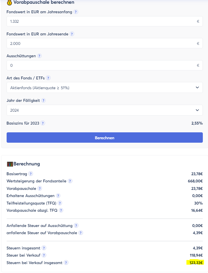 Sapine Juli 18, 2024 Probiere es aus und sag mir dann Bescheid. Du zahlst am Jahresanfang Steuern auf die Vorabpauschale und später im Jahr beim Verkauf der Anteile zahlst Du zusätzlich Steuern auf den noch unversteuerten Gewinnanteil. Und dann fehlt Dir noch das Geld zur Bezahlung der Steuern auf die Vorabpauschale wofür Du weitere Anteile verkaufen musst und erneut Steuern auf den unversteuerten Gewinnanteil zahlst. Dein Beispiel hat deutlich weniger als 50 % unversteuertem Gewinnanteil beim Verkauf. Daher kommt auch nur Murks raus bei der Berechnung. Diesen Beitrag teilen Link zum Beitrag