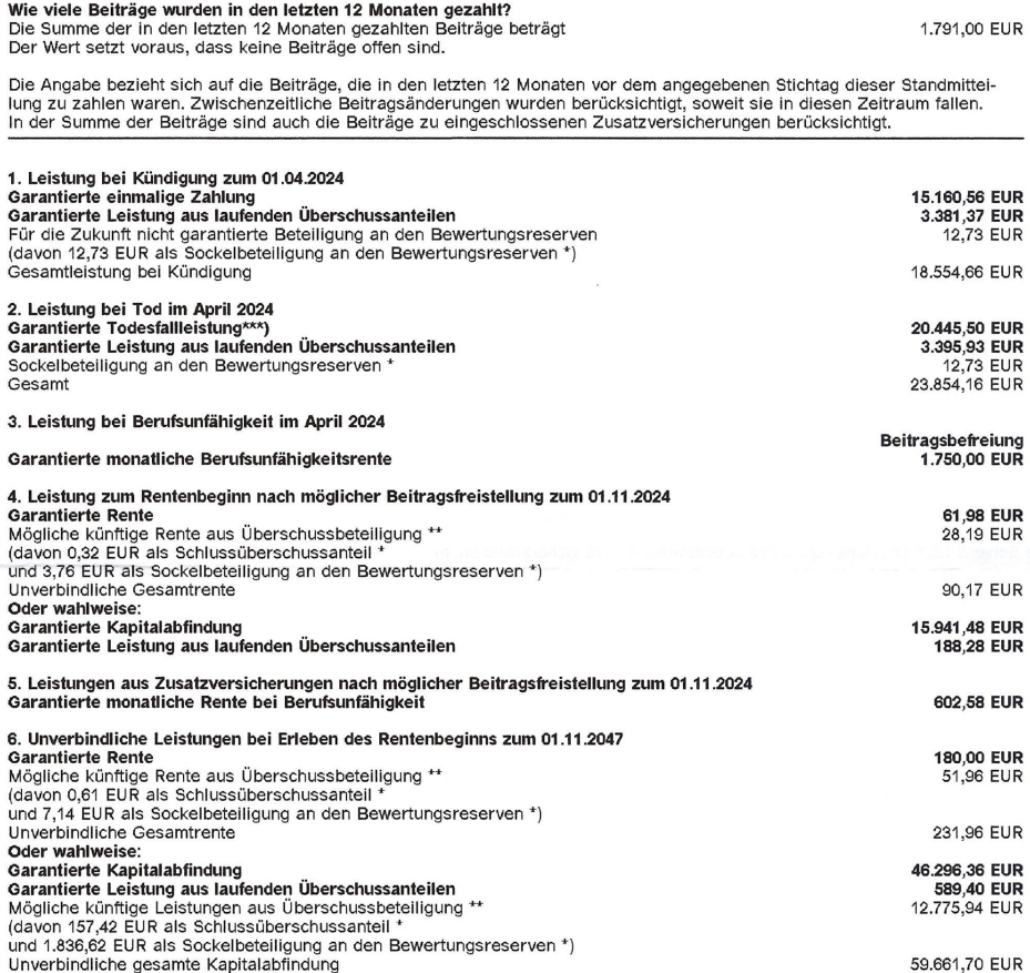 mjoe Juli 22, 2024 · bearbeitet Juli 22, 2024 von mjoe Guten Abend, durch einen AG Wechsel bestand keine Möglichkeit den vorhanden BAV des alten AGs beim neuen weiterzuführen. Also Option blieb diesen beitragsfrei zu stellen oder privat aus dem Netto weiterzuführen. Um mir erst mal die Optionen weiter offen zu halten entschied ich mich für das weiterführen des Vertrages da dort auch eine BU-Rente mit 1.750€ monatlich damals abgeschlossen wurde und sich diese nicht aus dem Vertrag herauslösen lässt. Die Eckpunkte des Vertrages Ergo-Versicherung, abgeschlossen 2010, Direktversicherung mit Gehaltsumwandlung nach REN910001Z / RAR mit TOP-BUZ monatlicher Beitrag inkl. 5% Ratenaufschlag: 149€ Garantierte monatliche Rente ( Rentenbeginn 11/2047): 180 €, Rentengarantiezeit 18 Jahre BU Rente: 1.750€ monatlich ( bis11/2045) im BU-Fall Beitragsbefreiung Vertragsstand 2024 Aufschlüsselung des Beitrags Jährliche Kosten des Vertrages inkl. Ratenzuschlag: Ich besitze noch eine weitere BU-Versicherung in Schicht 3, bis 08/2047, aktuell 1.241€ BU-Rente (3% Dynamik), diese hat aktuell einen Zahlbeitrag von 77€. Auf Grund meiner gesundheitlichen Situation ist ein Abschluss einer anderen BU-Versicherung quasi fast unmöglich. Bei der Rente habe ich mich soweit eingelesen, das eine Abgrenzung der Beiträge/Ansprüche erfolgt, zwischen dem Zeitraum der Entgeltumwandlung und der privaten Weiterführung des Vertrages, wie verhält es sich denn jetzt aber wenn ein BU-Fall eintritt und die BU-Rente gezahlt wird? Wird diese ebenfalls abgegrenzt? In der letzten jährlichen Vertragsstandsmitteilung konnte ich ersehen, das eine BU Anwartschaft von knapp 600€ bestehen bleibt wenn der Vertrag zum 01.11.2024 beitragsfrei gestellt wird, wäre das dann auch der Abgrenzungsbeitrag bei der möglichen BU-Rente ? Danke und viele Grüße! Diesen Beitrag teilen Link zum Beitrag