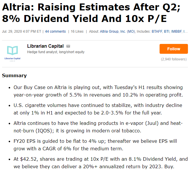 Flughafen August 15, 2020 Kein schlechter Artikel bei seekingalpha: Altria: Hikes And Increased Income, Against All Odds, Yield 8% Pro: * IQOS ist genehmigt und kann ausgerollt werden, wenn auch langsam => Perspektiven im NGP-Bereich * fürs Jahr wird ein Wachstum von 0-4% erwartet. Für das Corona-Jahr, bei dem das Welt-BIP um 4-6% einbrechen werde (in den USA wahrscheinlich mehr) ist das eine gute Leistung. Die Aktie ist kein Profiteur der Corona, wie manche Techs und die Pharma, aber unter diesen Bedingungen Gewinne zu steigen ist auch schon mal eine gute Leistung. * das Verkaufsvolumen wird dieses Jahr wohl nur 2-3% zurückgehen, statt wie ursprünglich erwartet um 4-6%. In Stresszeiten rauchen die Leute wohl mehr. Contra: * JUUL könnte wertlos werden, damit sind die gezahlten 12,8 Mrd futsch * die Steuerpolitik beinhaltet hohe Risiken. Diesen Beitrag teilen Link zum Beitrag