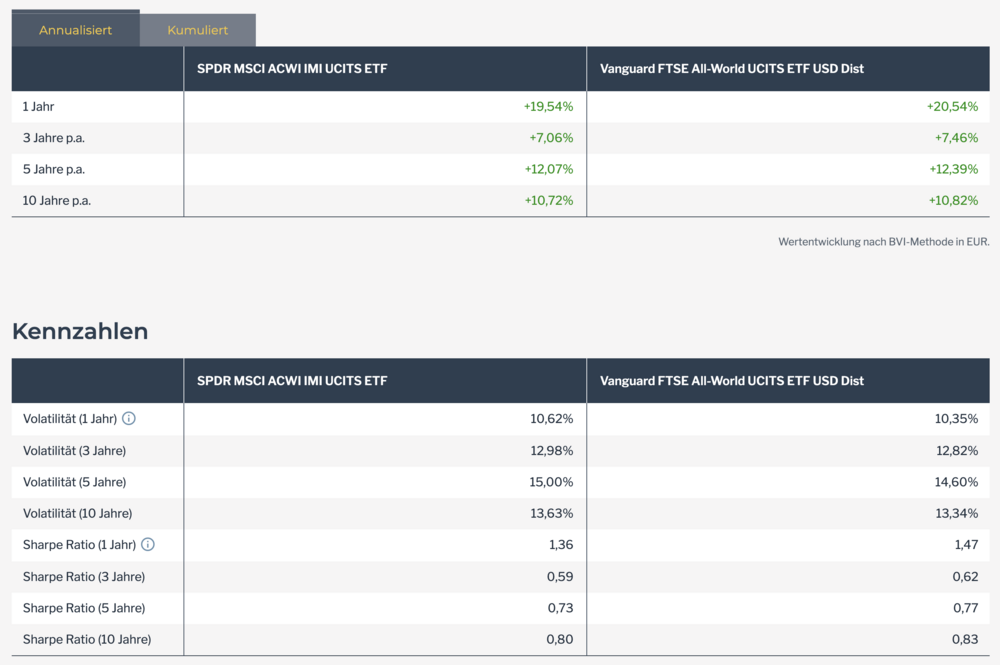 MichaelE August 18, 2024 Der All World hat aktuell 3695 Positionen und die zehn größten Positionen haben ein Gewicht von 21,66%. Der ACWI IMI hat 3498 Positionen und die zehn größten Positionen 19,82%. Für mich ist damit der SPDR attraktiver. Die beiden ETFs sind aber ziemlich vergleichbar. Ich habe jahrelang den All World bespart und vor einem Jahr mit dem SPDR weitergemacht. Das hat weniger mit der niedrigeren TER zu tun, sondern ich will irgendwann in der Auszahlphase steuerlich nicht komplett auf FIFO setzen müssen. Finanztip hat durchgerechnet, dass man mit einem regelmäßigen Wechsel der ETFs einiges an Steuern in der Auszahlphase sparen kann. Gibt hierzu auch auf YT ein entsprechendes Video auf deren Kanal. Natürlich macht ein Wechsel nur Sinn, wenn man vergleichbare ETFs verfügbar hat. Diesen Beitrag teilen Link zum Beitrag