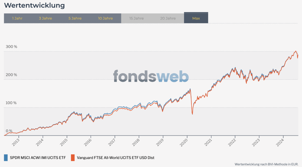 Euronensammler August 18, 2024 · bearbeitet August 18, 2024 von Euronensammler vor 1 Stunde von andi-invest: Mein persönlicher Favorit ist aktuell trotzdem noch der Vanguard => etablierte Lösung IE00B3YLTY66 SPDR MSCI ACWI IMI Auflagedatum 13-May-2011 IE00B3RBWM25 Vanguard FTSE All-World Auflegung der Anteilsklasse 22. Mai 2012 IE00BK5BQT80 Vanguard FTSE All-World Auflegung der Anteilsklasse 23. Juli 2019 IE000DD75KQ5 SPDR® MSCI ACWI IMI (Dist) Auflagedatum 03 Jul 2024 Wiso ist der Vanguard etabliert und der SPDR nicht? Ich vermute, dass die größere Zahl der Heiligen-Grals Anhänger ihre Wirkung auf Dich erzielt haben. Ansonten: Mir ist es egal, den Fonds ist es egal und wahrscheinlich wird es Dir auch irgendwann egal sein. Ausser ein Anbieter ändert den zugrunde liegenden Index oder fabriziert eine sonstige steuerschädliche Änderung. Diesen Beitrag teilen Link zum Beitrag