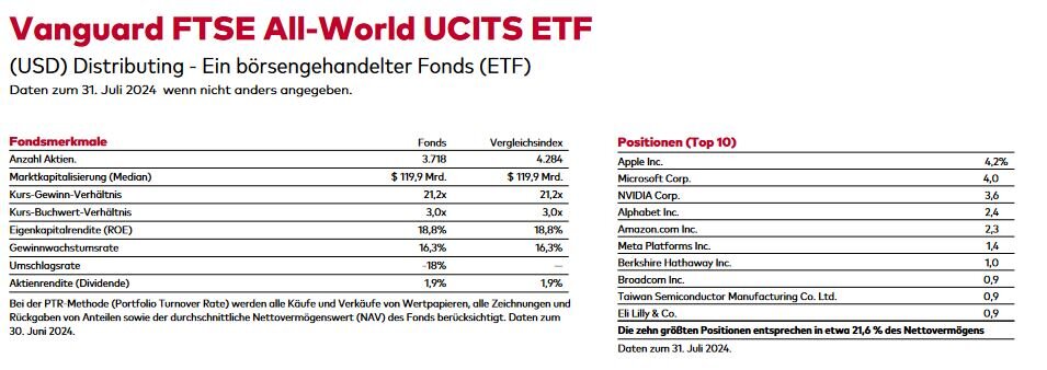 satgar August 19, 2024 vor 3 Stunden von MichaelE: Aktuelles Factsheet All World neben SPDR: Im All World Blatt schreibt Vanguard ja selbst 21,6%. Wenn ich die Top 10 des SPDR zusammenzähle (Siehe Bild 2, Factsheet vom Juli) dann komme ich auf 18,81%. Übersehe ich was? Du vergleichst auch wieder die Fondstitel miteinander. Ich dachte, es ginge dir um die Indices? Da legt man doch drin an. Der ETF und seine gehaltenen Positionen dienen doch lediglich der Abbildung. Letztlich spielen (sollen spielen!) diese keine Rollen. Den Index gilt es zu vergleichen. Diesen Beitrag teilen Link zum Beitrag