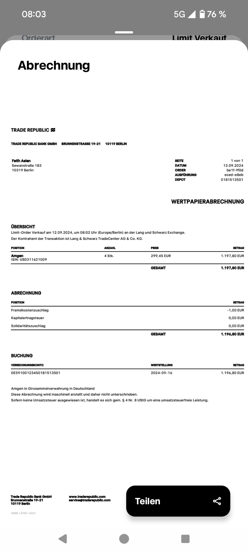 reckoner September 12, 2024 · bearbeitet September 12, 2024 von reckoner Hallo, Zitat Eben gerade Aktien mit Gewinn verkauft und es wurden mir keine Steuern abgezogen? Nur zur Sicherheit: Freistellungsauftrag ist da aber keiner mehr? Stefan Diesen Beitrag teilen Link zum Beitrag