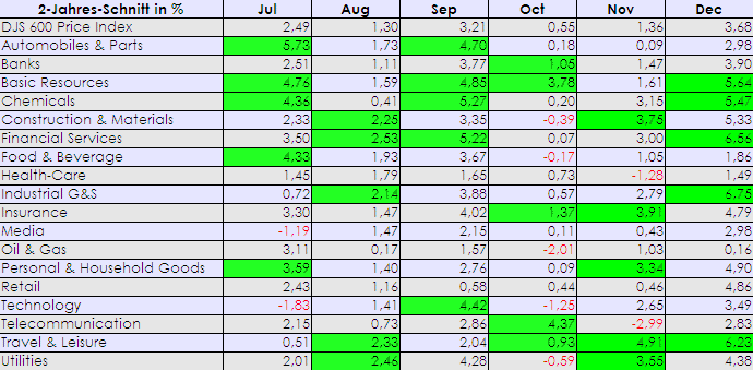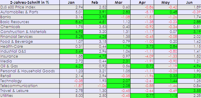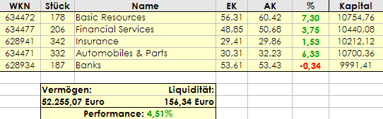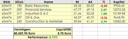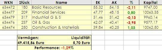 et3rn1ty September 29, 2006 · bearbeitet Dezember 29, 2006 von et3rn1ty Hallo zusammen. Der DJ Stoxx 600 hat mich zu der Idee veranlasst auf Basis dieses Index ein Musterdepot zu eröffnen. Thema: Aktives Portfolio-Management Wie schon im Stoxx 600 Thread veröffentlicht, findet auch hier die Übersicht über die aussichtsreichsten Sektoren Verwendung. Die Regeln: - Start: 01. Januar 2007 - Startkapital: 50.000 Euro - Streuung auf 5 Werte a 10.000 Euro - gehandelt werden Monat für Monat verschiedene ETF´s des jeweiligen Sektors, der zu den 5 Besten Sektoren des Monats gehört (Bsp.: Januar - Basic Resources, Oil&Gas, usw.) - alle gehaltenen ETF´s werden zum Ende des Monats liquidiert (auch wenn der Sektor im folgenden Monat ebenfalls zu den Top5 gehört), dadurch können anfallende Erträge im nächsten Monat wieder angelegt werden Strategie: - die Sektorentabelle wird für die nächsten Jahre weiterhin angepasst, so dass die Durchschnittsperformance (3 Jahre, 10 Jahre, usw.) weiter verfeinert werden kann Ziel: - Ziel des Musterdepots ist es den zu Grunde liegenden Index (DJ Stoxx 600) zu schlagen Im Januar kommen ETF´s aus diesen Sektoren in das Depot: 1. Basic Resources 2. Construction & Materials 3. Oil & Gas 4. Industrial G&S 5. Financial Services Grüße, et3rn1ty. Diesen Beitrag teilen Link zum Beitrag