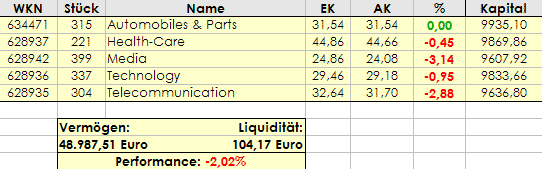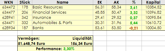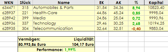 et3rn1ty Januar 2, 2007 Kauf Stück - WKN - Einstandskurs - Spesen 180 - 634472 - 55,32 - 29,84 250 - 634474 - 39,84 - 29,85 237 - 634476 - 42,07 - 29,88 317 - 634479 - 31,46 - 29,88 209 - 634477 - 47,77 - 29,91 verbleibende liquide Mittel: 5,70 Euro. Grüße, et3rn1ty. Diesen Beitrag teilen Link zum Beitrag