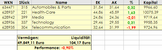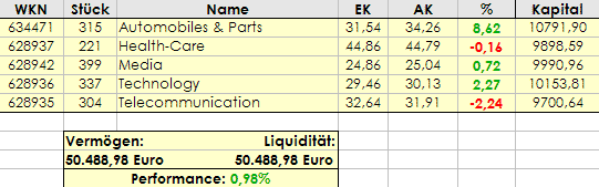 et3rn1ty Januar 1, 2007 Das Musterdepot startet am 02. Januar 2007. Als Beste Sektoren des Monats Januar der vorigen 2 Jahre haben sich... 1. Basic Resources 2. Construction & Materials 3. Oil & Gas 4. Industrial G&S 5. Financial Services ...herausgestellt. Für diese 5 Sektoren werden laut den Regeln die entsprechenden ETF´s ins Depot aufgenommen. Alle ETF´s kommen zum Eröffnungskurs der Xetra-Börse in das Depot. Am Ende des Monats werden alle Positionen liquidiert. Viel Spaß beim Mitverfolgen des Depots. Grüße, et3rn1ty. Diesen Beitrag teilen Link zum Beitrag