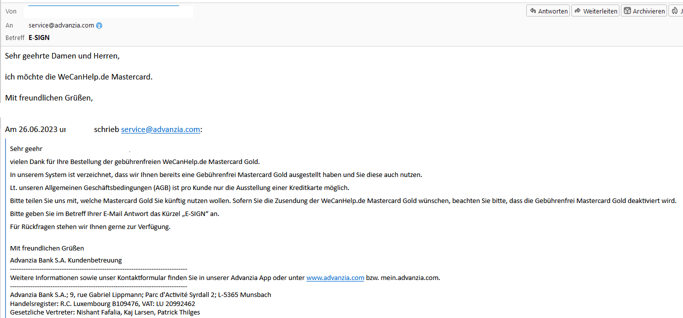 Wenn ich mich recht erinnere habe ich einfach die WeCanHelp Mastercard auf deren Webseite bestellt. Daraufhin folgte folgende Emailkorrespondenz: