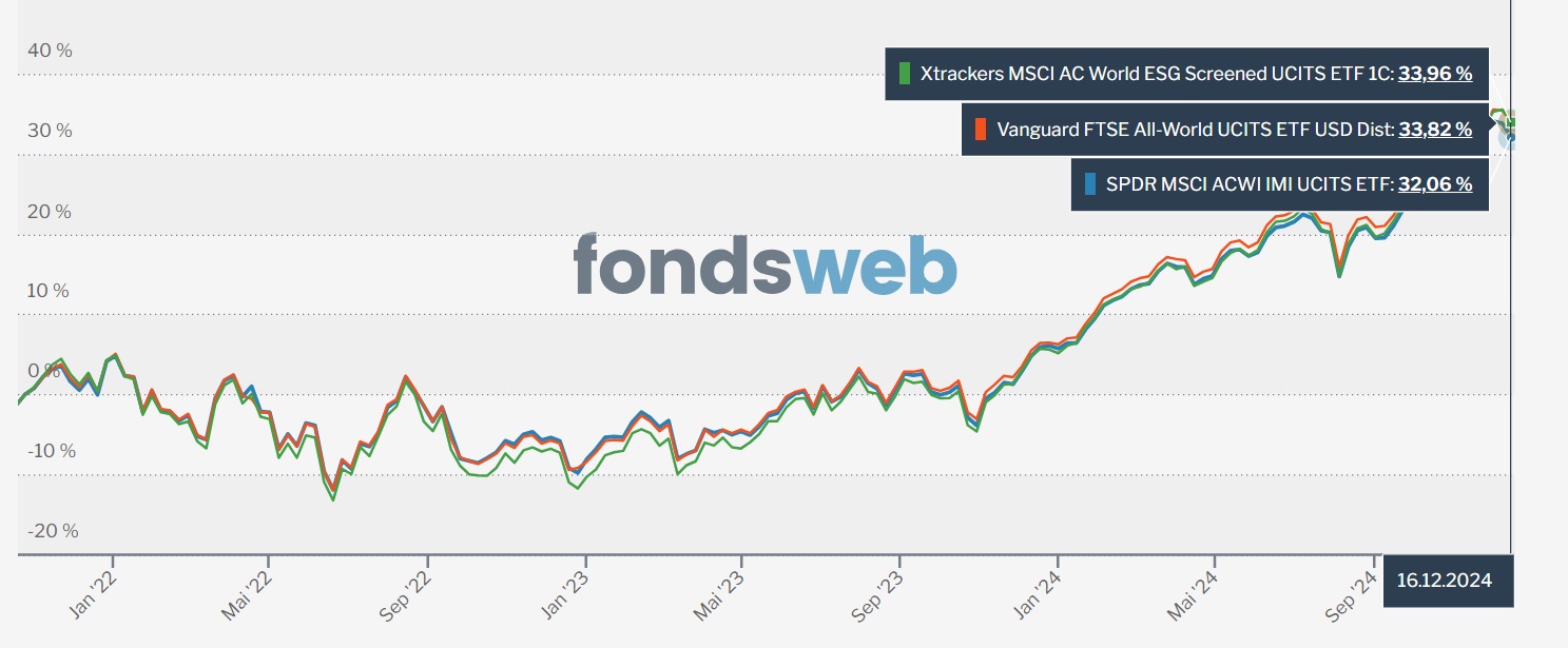 Puppi Dezember 23, 2024 · bearbeitet Dezember 23, 2024 von Puppi vor 35 Minuten von Biggi: Und für welchen hättest Du Dich entschieden, wenn monatlich für 300 Euro gekauft wird? Ich kann ja bei FNZ nochmal den Fonds ändern lassen. Ich würde den hier von mir schon Vorgeschlagenen nehmen: Am 5.11.2024 um 13:26 von Puppi: @Biggi Eine Möglichkeit bei der FNZ Bank ist noch dieser ETF: https://etf.dws.com/de-de/IE00BGHQ0G80-msci-ac-world-esg-screened-ucits-etf-1c/ Der wird in Euro geführt und damit hast du keine Währungskosten bei der FNZ. Ich weiß aber nicht, ob dich das ESG stört. Viel machen die fehlenden Firmen aber nicht aus. Die Entwicklung des ETF ist ziemlich deckungsgleich mit den beliebten Pridukten hier, also z.B. dem Vanguard All World. Der Xtrackers wurde am 20.10.2021 auf ESG umgestellt. Die Entwicklung seit diesem Datum im Vergleich zur hier oft genannten "Referenz" ist hier zu sehen: https://www.fondsweb.com/de/vergleichen/ansicht/isins/IE00B3YLTY66,IE00B3RBWM25,IE00BGHQ0G80 Diesen Beitrag teilen Link zum Beitrag