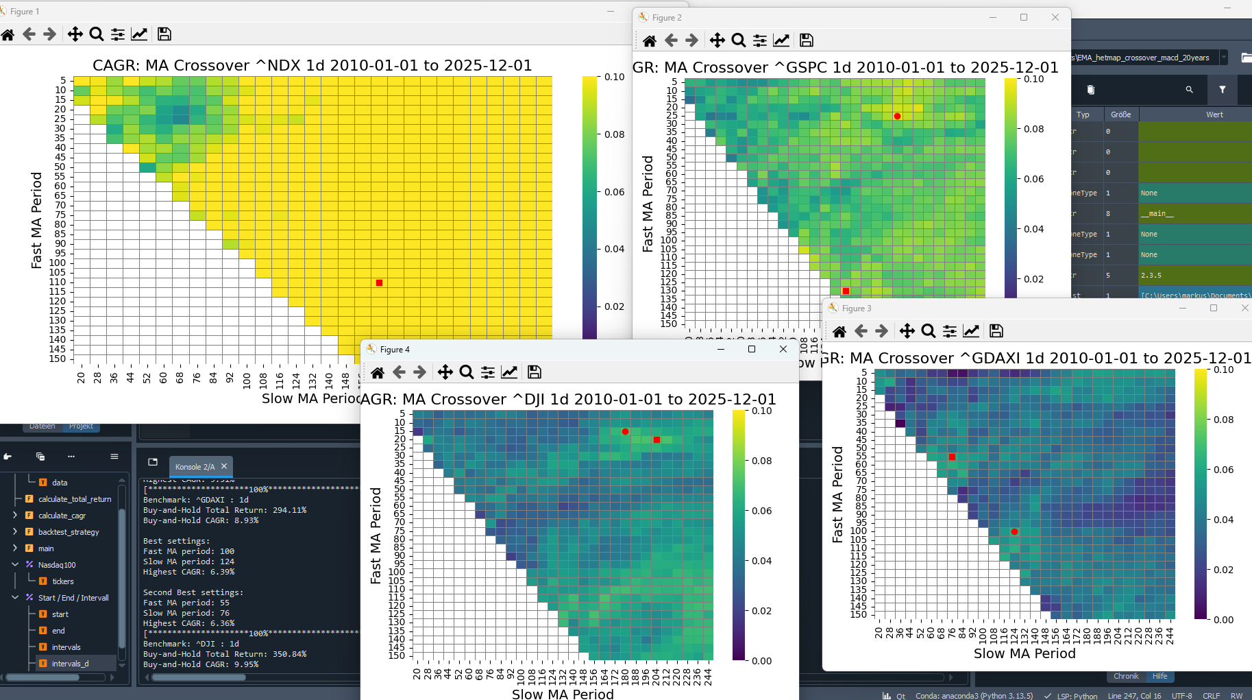 Luftball0n 14. Dezember vor 4 Stunden von ghost_69: so jetzt bin ich mal die 3-Filter Strategie angegangen. ... Guten Abend, 1.) habe es den Score etc. für mich erweitert und in diesem Zug die Optik verfeinert: schlichter Hintergrund Globaler Filter & nur bei Golden-Cross, Ema200 sowie bei der Empfehlung Zoom-Fähigkeit und auto-spaltenbreite außer bei dem Chartbild Für Ticker könnte man die Symbole auslagern in eine txt-Datei bzw. csv: Ggf. erstellen lassen und dann in importieren (aktuell bekomme ich yfinance API Limit errors ....), daher mal nur manuell im Code..... aber für andere Projekte ggf. interessant, hier die Hauptfunktionen: # -*- coding: utf-8 -*- """ Created on Sun Dec 14 17:00:25 2025 @author: Luftball0n """ #Shorten Codesnippet ... # Functions to fetch data def list_slickcharts(url: str) -> pd.DataFrame: user_agent = 'Mozilla/5.0 (X11; Linux x86_64; rv:109.0) Gecko/20100101 Firefox/111.0' response = requests.get(url, headers={'User-Agent': user_agent}) html_data = StringIO(response.text) df = pd.read_html(html_data, match='Symbol', index_col='Symbol')[0] return df # Function to save only symbol and company name to CSV def save_tickers_to_csv(df, filename): subset = df[['Symbol', 'Company']].copy() subset.to_csv(filename, index=False) # Function to export DataFrame to CSV def export_dataframe_to_csv(df, filename): df.to_csv(filename) # Function to import DataFrame from CSV def import_dataframe_from_csv(filename): return pd.read_csv(filename, index_col='Symbol') 2.) Bezüglich der 3-Filter Strategie, interessant, aber ob ich danach handeln würde - eher nicht. Die Settings lassen sich mit dem Onvista-Screener (stand 2019) und bestimmt auch Finviz filtern. -> https://www.wertpapier-forum.de/topic/1042-drei-filter-strategie-kuv/page/24/?tab=comments#comment-1210998 3.) Was ich mir vor einiger Zeit erstellt habe ist ein Optimum-Finder für EMA-Cross strategy. Kann man auch für MACD etc. übertragen inkl. daily/weekly Damit hab ich ein anderen ultimativen Screener gebaut, der per BatchFile 2x pro Woche im Hintergrund startet, um von einigen Indikatoren bestimmte Signale zu erzeugen. Dabei werden die Symbole extern importiert (aktuell 101, und ab und an mit ca. 500 nur US-Markt)... Speziell die Kombination mit den passenden Emas, Indikatoren auf höheren Zeitebenen fungieren für mich gut für überschaubare Derivate-Trades (Laufzeit bis ~1Jahr)! Diesen Beitrag teilen Link zum Beitrag