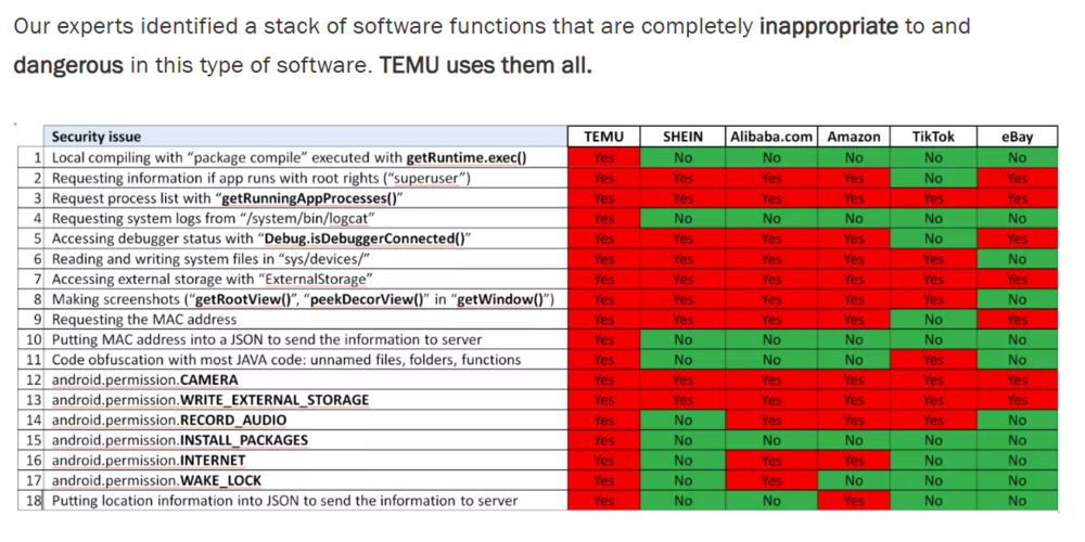 Cinquetti November 19, 2024 Letztes Jahr gab es ziemlich heftige Vorwürfe von Grizzly Research gegen Temu: We believe PDD is a Dying Fraudulent Company and its Shopping App TEMU is Cleverly Hidden Spyware that Poses an Urgent Security Threat to U.S. National Interests und im Mai diesen Jahres kam dann diese Meldung raus: Arkansas Attorney General Files Lawsuit Against PDD for its TEMU App Based on Grizzly’s Investigation Ars Technica hat im Juni auch nochmal darüber berichtet: Shopping app Temu is “dangerous malware,” spying on your texts, lawsuit claims Auf Reddit gibt es dazu auch noch eine interessante Diskussion: Temu "confirmed" as Spyware by Arkansas Attorney General, yet Google still allows Temu ads Grizzly Research hat für mich nicht den Stellenwert wie Hindenburg Research oder HedgEye. Von daher sollte man das eher als interessante Side-Note zur Kenntnis nehmen. Die App würde ich aber definitiv nicht installieren Diesen Beitrag teilen Link zum Beitrag