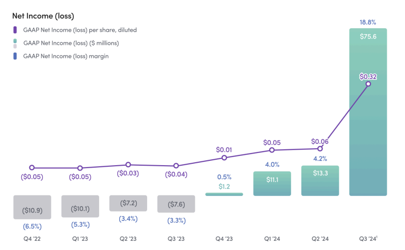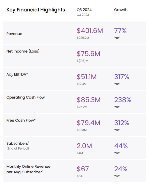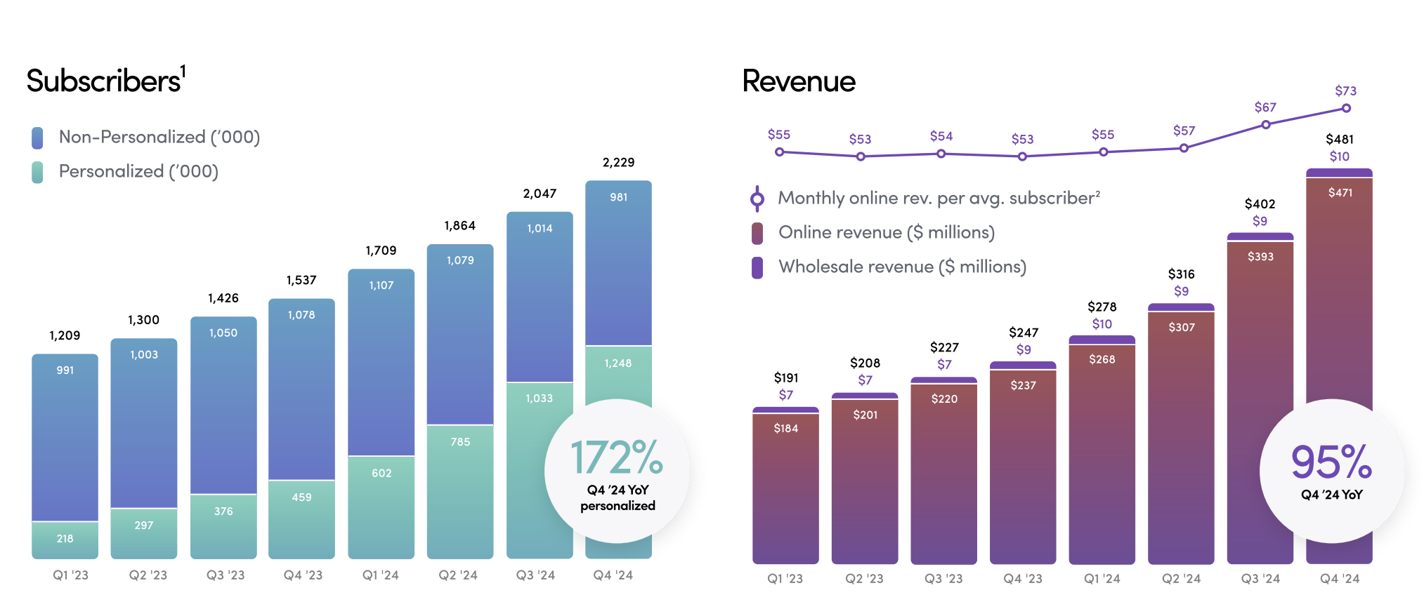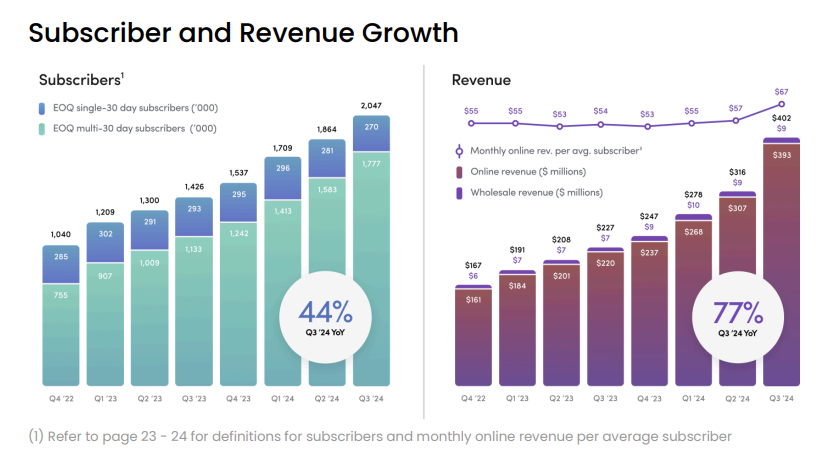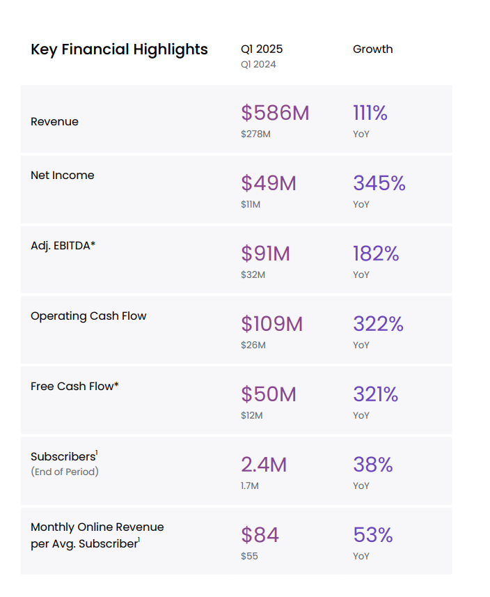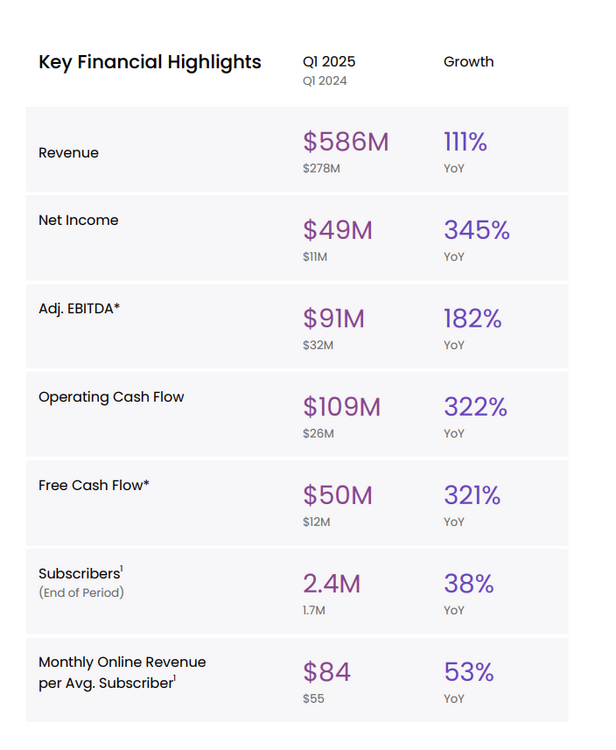 Gast250606 Mai 8, 2025 Q1 Zahlen sind draußen Zitat Revenue of $586.0 million, up 111% year-over-year in Q1 2025 Net income of $49.5 million; Adjusted EBITDA of $91.1 million in Q1 2025 Subscribers grew to 2.4 million, up 38% year-over-year in Q1 2025 Affirms full year 2025 revenue guidance of $2.3 billion to $2.4 billion and raises Adjusted EBITDA guidance to a range of $295 million to $335 million Introduces 2030 targets of at least $6.5 billion in revenue and $1.3 billion in Adjusted EBITDA Diesen Beitrag teilen Link zum Beitrag