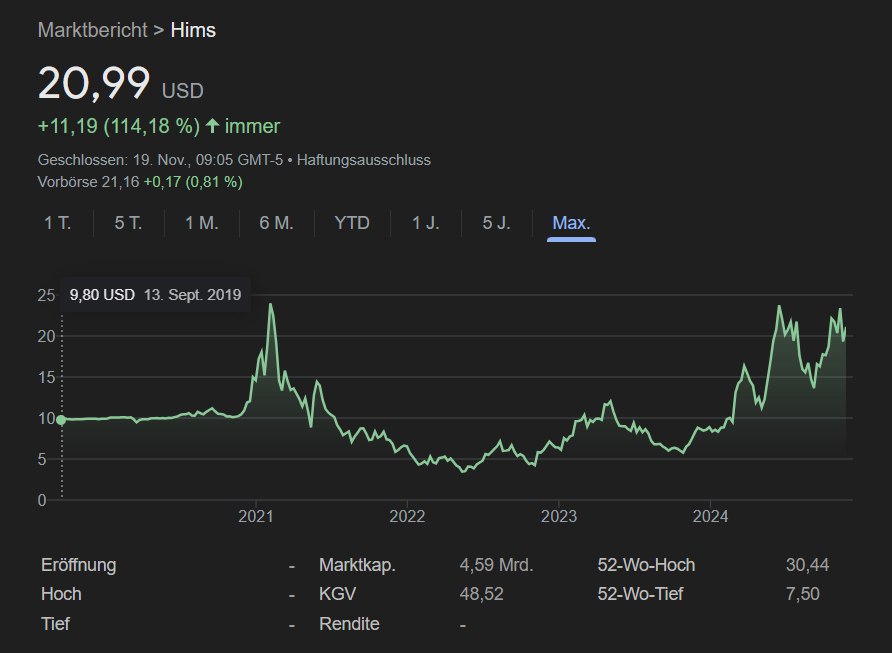Gast250606 November 19, 2024 · bearbeitet November 19, 2024 von Maestro315 Hierzu gibt es offenbar noch gar keinen Topic. HIMS & HERS US4330001060 Gründung : 2017 Branche : Telepharmazie Hims & Hers ist ein Gesundheitsunternehmen. Im Kern versendet es Medikamente und Gesundheitsprodukte, gerade solche, die unbequeme Themen bedienen: Haarausfall, erektile Dysfunktion, Depression, Angststörungen und weitere. Gestartet wurde mit Produkten für Männern, mittlerweile werden auch Frauen abgedeckt. Die Mission ist größer und die einer Gesundheits- und Wellness-Plattform: Hims & Hers is the leading health and wellness platform on a mission to help the world feel great through the power of better health. We believe how you feel in your body and mind transforms how you show up in life. That’s why we’re building a future where nothing stands in the way of harnessing this power. Hims & Hers normalizes health & wellness challenges—and innovates on their solutions—to make feeling happy and healthy easy to achieve. Der Dienst ist vor allem in Nordamerika aktiv. Wer auf die Homepage geht kann Fragen beantworten und bekommt darauf basierend die Produkte von Hims & Hers vorgeschlagen, die im Abo bestellt werden können. Die Aktie hat natürlich auch Ihre Hype Phasen in 2021/22 mitgenommen. Nach den Q3 Meldungen aber positiv überrascht, Positives Net Income und Free Cashflow. Bei einem derzeitigen Marketcap von 4 Mrd und diesem Wachstum auf jeden Fall noch sehr fair bewertet wenn nicht sogar unterbewertet. Die Frage nach einem richtigen MOAT bleibt für mich aber weiterhin etwas ungeklärt, Amazon möchte ja auch in diesen Bereich vorstoßen... Diesen Beitrag teilen Link zum Beitrag