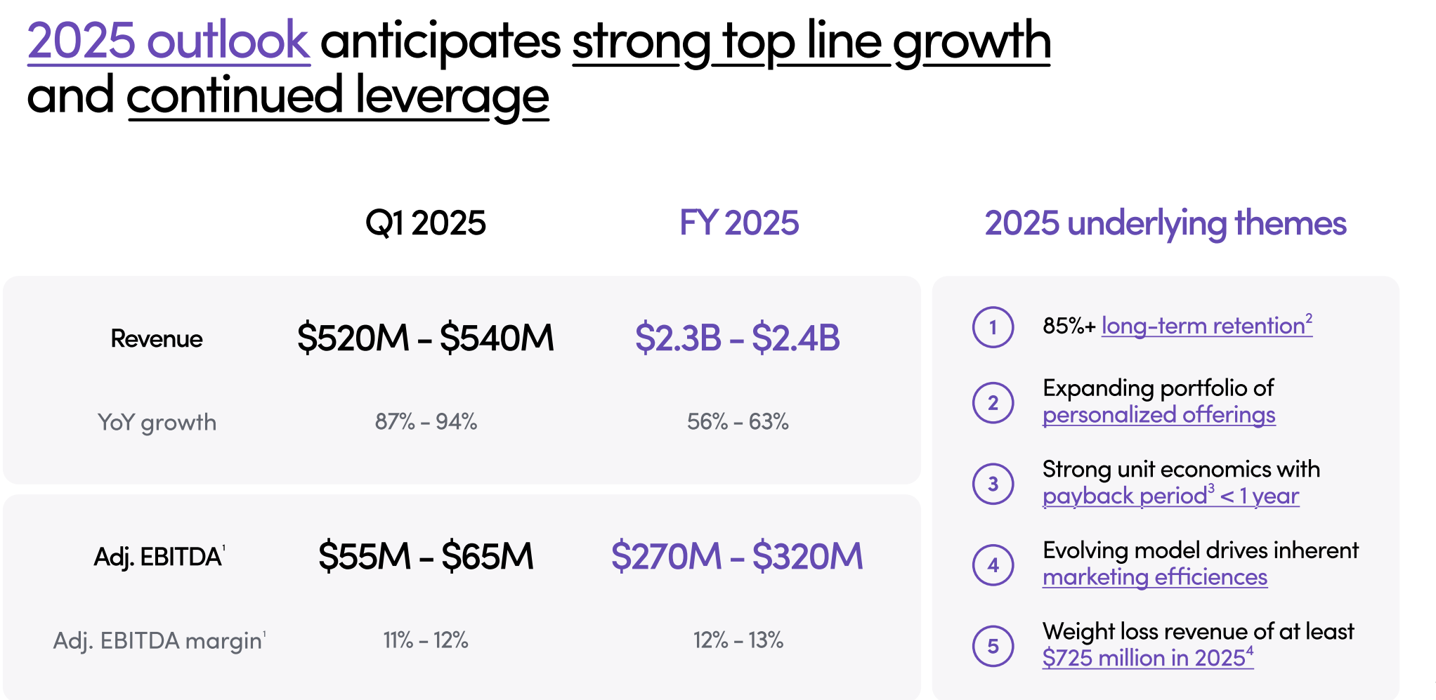 Gast250606 Februar 25, 2025 · bearbeitet Februar 25, 2025 von Maestro315 HIMS verkündigt seine Zahlen : https://investors.hims.com/news/news-details/2025/Hims--Hers-Health-Inc.-Reports-Fourth-Quarter-and-Full-Year-2024-Financial-Results/ Highlights : Subscribers 45%+ ( FY ) Umsatz 69% + ( FY ) EBITDA Marge von 6 -> 12% Monatlicher Umsatz per User 73 $ FY 2025 ca. 2,4B Umsatz Diesen Beitrag teilen Link zum Beitrag
