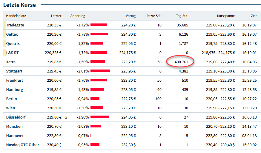 dev November 27, 2024 · bearbeitet November 27, 2024 von dev Bei SAP auf Xetra gibt es fast minütlich mehrere Transaktionen, bei den anderen Börsen nicht mal jede Minute einen. Hier kannst du dir sogar einen Teil ( die nächsten 10 ) des Xetra-Orderbuches ansehen. Der Spread ist oft bei 5 cent, kleiner gibt es bei SAP auf Xetra nicht Viel entscheidender ist, sich die Börse mit dem größten Umsatz heraus zu suchen, dann bekommt man auch sein Limit: Diesen Beitrag teilen Link zum Beitrag