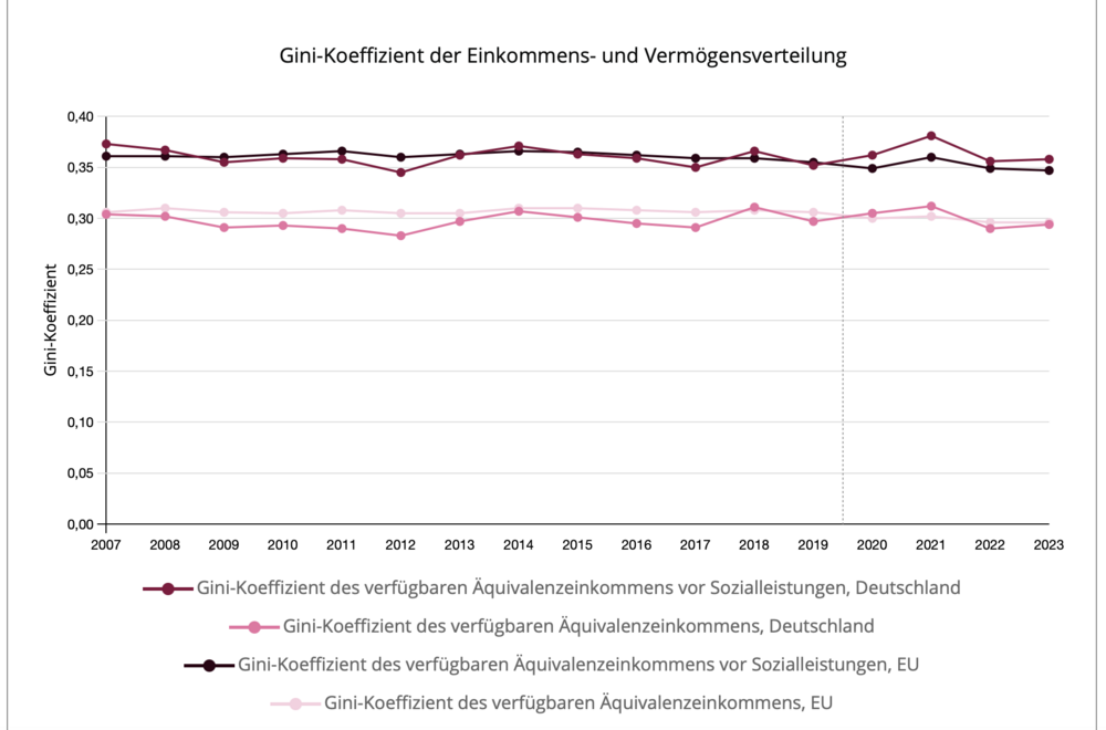 In Deutschland finde ich das Verhältnis aber schwierig. Wenn man den Gini-Koeffizienten für die Vermögensverteilung in Deutschland mit 0,76% sieht (1 sehr ungleich, 0 alle gleich), dann ist die Tendenz stark zu "sehr ungleich" ausgerichtet. Das ist nicht ok.