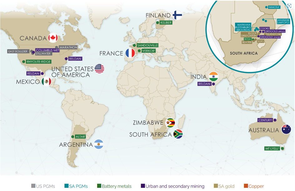 Wo ist Sibanye Stillwater in der Welt aktiv (Stand 2023):
