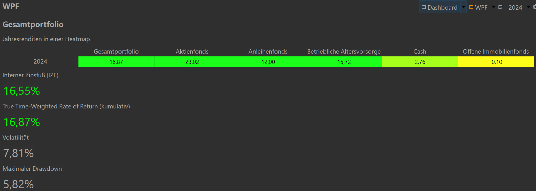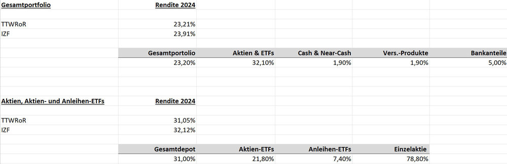 Mojo-cutter Dezember 31, 2024 · bearbeitet Dezember 31, 2024 von Mojo-cutter läuft Meine Kennzahlen 2024 (Berechnet mit Portfolio Performance, wie immer nicht ganz richtig, da Anleihen in PP nicht korrekt wiedergegeben. Tendenz ist aber richtig): 2024 2012-2024 IZF 17,8 % 6,65 % TTWRoR 17,9 % 118 % Max. DD 5,04 % 27,2 % Volatilität 7,17 % 36,9 % Asset Allokation: Aktien 64%. Den Rest kann man aus der Grafik schätzen. Da kommt mir es auf 5% hin oder her nicht an. wer es genauer haben möchte, sehe im Musterdepot nach Diesen Beitrag teilen Link zum Beitrag