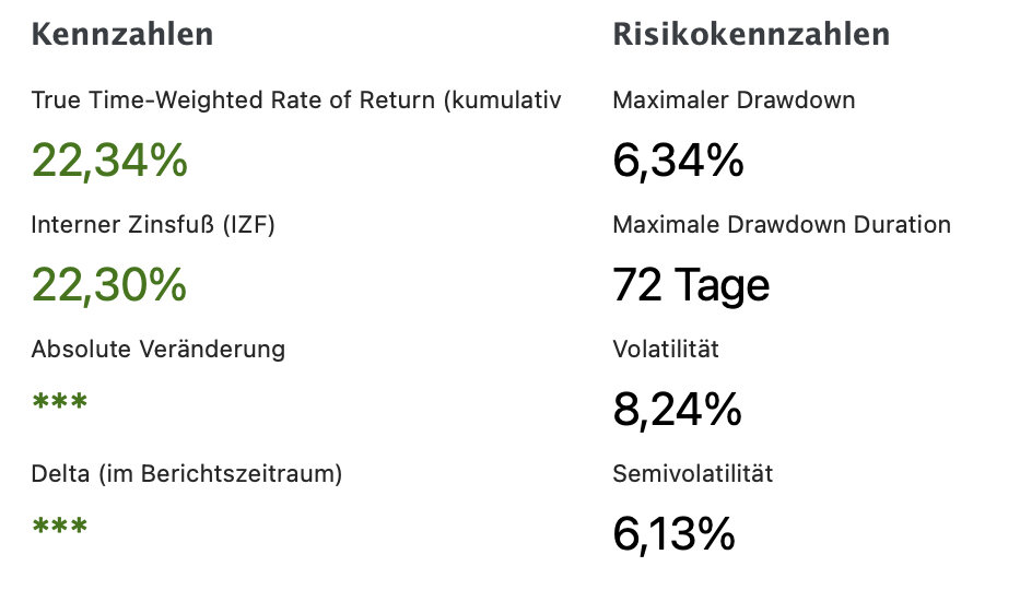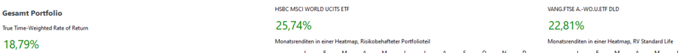 Merol Rolod Dezember 31, 2024 Portfolio Performance gibt mir folgende Daten aus. Die ungefähre Aufteilung siehe Link in meiner Signatur. Gesamtportfolio TTWRR: 17,20 % Max. DD: 6,88 % Vol.: 8,87 % Risikoarm TTWRR: 2,88 % Riskant TTWRR: 20,11 % Max. DD: 8,00 % Vol.: 10,15 % Im riskanten Teil unterscheide ich noch Aktien Welt (Welt-ETFs) und Länder- und Strategiewetten und Einzelaktien: Welt-ETFs TTWRR: 24,32 % Max. DD: 8,12 % Vol.: 10,81 % ETFs Länder- und Strategiewetten TTWRR: 32,99 % Max. DD: 8,94 % Vol.: 10,97 % Einzelaktien TTWRR: -33,86 % Max. DD: 38,08 % Vol.: 29,21 % Diesen Beitrag teilen Link zum Beitrag