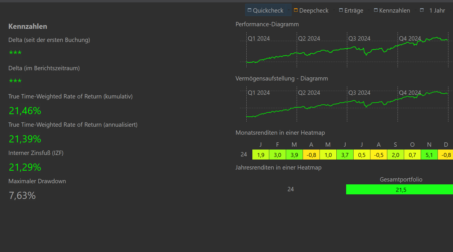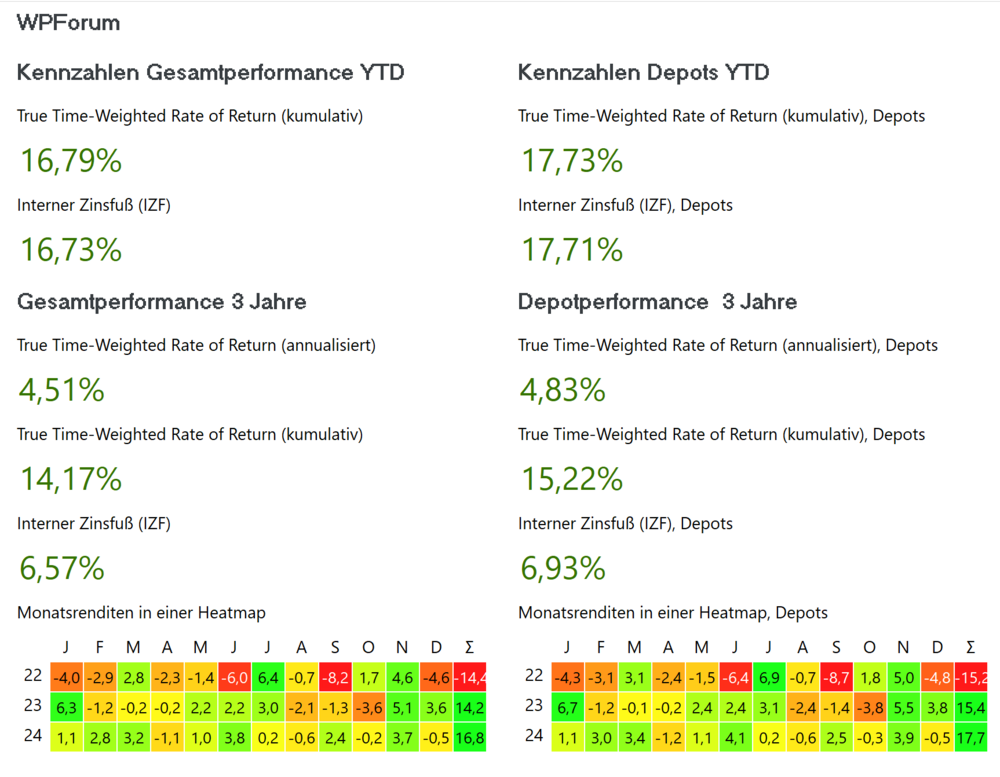 EddisHerrchen Dezember 31, 2024 · bearbeitet Dezember 31, 2024 von EddisHerrchen Hallo Zusammen, Ich bin sehr zufrieden mit 2024. Meine Aufteilung: 86,6% Aktien ETF, 6,1% Anleihen ETF, 2,6% Gold, 4,7% Cash, und wie bei Bast: BIP orientierte Aufteilung. vor 18 Minuten von EddisHerrchen: Zum Jahresabschluß gehört natürlich auch die Rendite. Da weist mit PP aus: Wobei hier das schlechte Jahr 2022 halt die 3 Jahresperformance versaut. Links ist meine Gesamtperformance, Rechts die der Depots. Und es geht mir wie @Bast - auch ich habe BIP Aufteilung, muß man sich halt leisten wollen. Aber in Summe ein tolles Ergebnis: Depotwert +260t€ in diesem Jahr, 25t€ Ausschüttung generiert. Ich bin super zufrieden mit diesem Jahr. Auf ein gutes neues Jahr! Gruß EddisHerrchen Diesen Beitrag teilen Link zum Beitrag