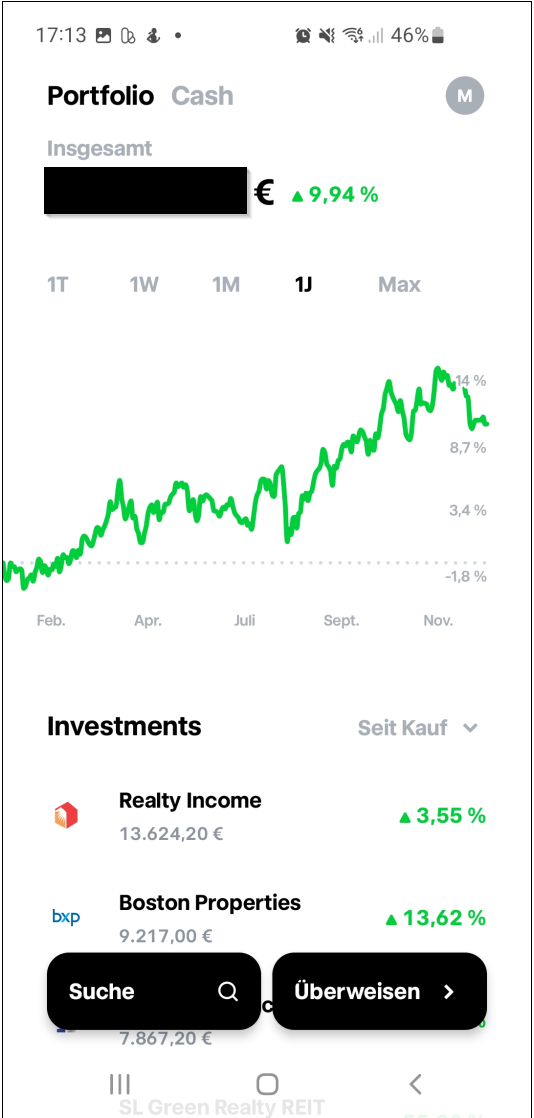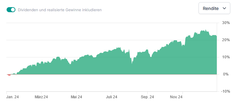 Cinquetti Dezember 31, 2024 · bearbeitet Dezember 31, 2024 von Cinquetti Mein Haupt-Aktienportfolio bei TR hat im vergangenen Jahr eine Gesamtperformance von 14,66 % erzielt. Neben einer Wertsteigerung von 9,94 % konnte ich durch Gewinnmitnahmen (DELL, Solventum & US Bancorp) 2.367,25 € sowie durch Dividenden weitere 7.625,00 € verbuchen. Während sich die REITs – ein großer Bestandteil meines Depots – erfreulich gut erholt haben (insbesondere die totgesagten Office-REITs), haben die Spirituosenaktien und die deutschen Automobilwerte leider sehr schwach performt. Ich habe außerdem ein kleines Konto bei F-Zero, das für Schweizer Aktien wie Nestlé und Roche genutzt wird. Zur Veranschaulichung füge ich wieder einen Screenshot bei. Dieses Depot hat in diesem Jahr 172,43 € an Dividenden eingebracht. Ich wünsche Euch allen einen guten Rutsch sowie ein glückliches, gesundes und erfolgreiches neues Jahr! Diesen Beitrag teilen Link zum Beitrag