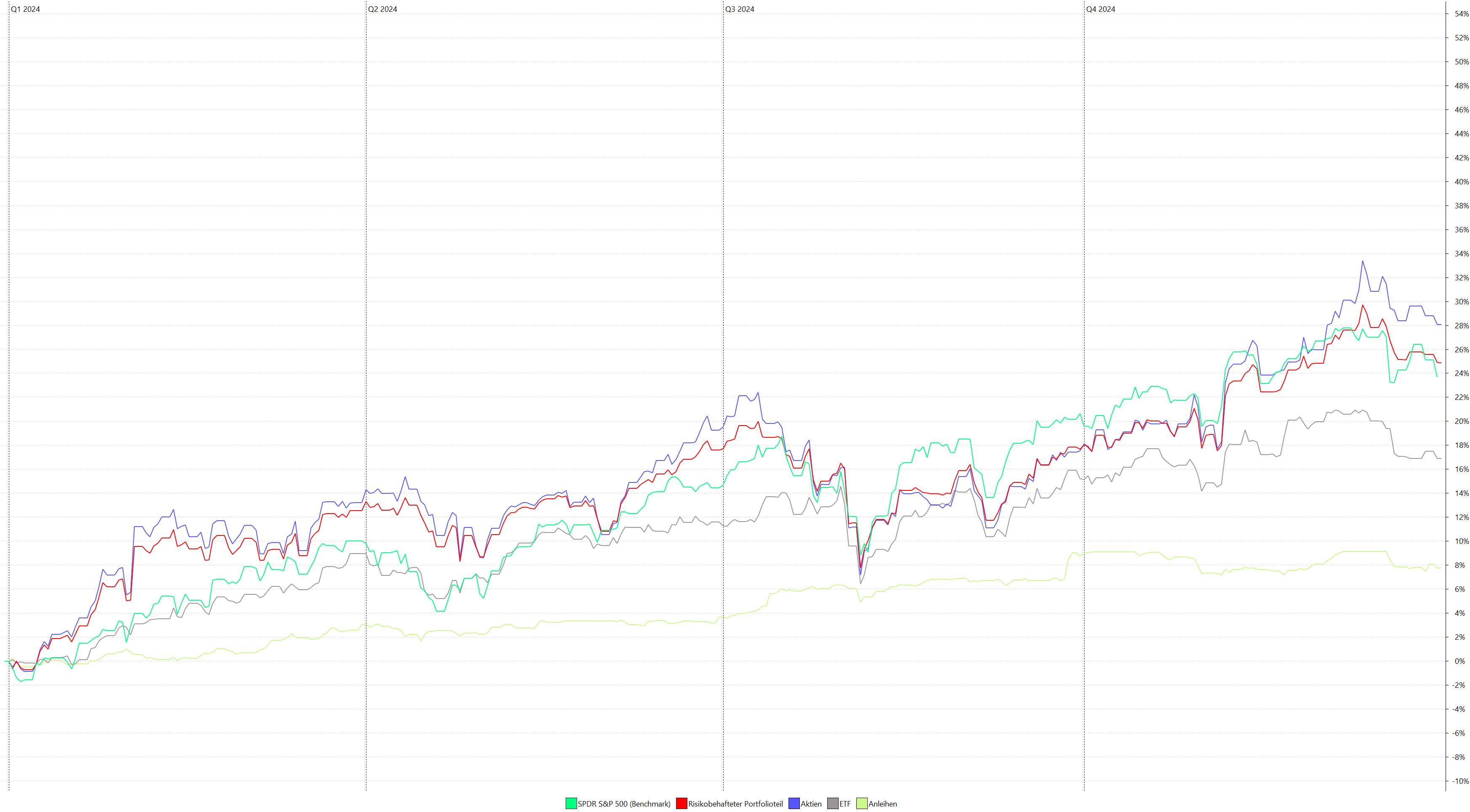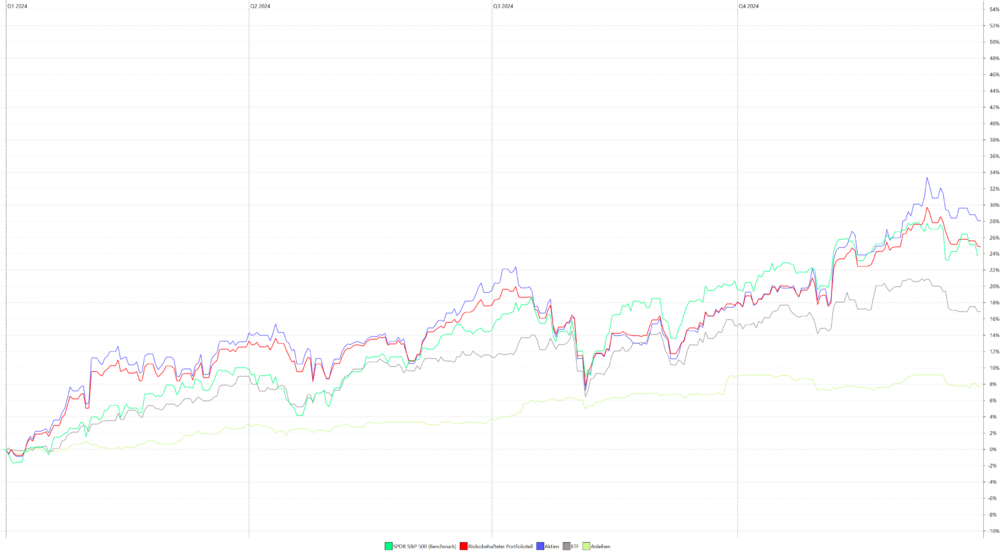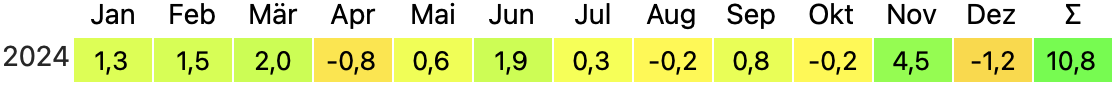 leoluchs Dezember 31, 2024 · bearbeitet Januar 4, 2025 von leoluchs Erträge von Consors und ING eingearbeitet Unsere AA ist hier zu sehen. Das Jahr 2024 sah in Zahlen so aus (Dividenden von Consors und ING fehlen, alles n.St.): IZF 10,63% TTWRR 10,82% Volatilität 5,25% Maximaler DD 3,58% Monatsrenditen: Mit der AA sind wir nicht schlecht gefahren (IZF unserer Aktien-ETF: 21,24%), aber die Benchmark haben wir nicht erreicht. Fazit: Sehr zufrieden. Diesen Beitrag teilen Link zum Beitrag