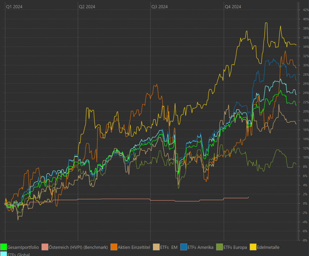 Fetz Dezember 31, 2024 · bearbeitet Dezember 31, 2024 von Fetz Ich bin ebenfalls zufrieden. Habe meine Benchmark (den thesaurierenden 80/20 von Vanguard) knapp übertroffen. 2025 erwarte ich deutlich weniger. Asset-Allokation: 80% Weltweite ETF, 5% Bitcoin, 5% Gold, 10% Rest Bar/Anleihen Diesen Beitrag teilen Link zum Beitrag