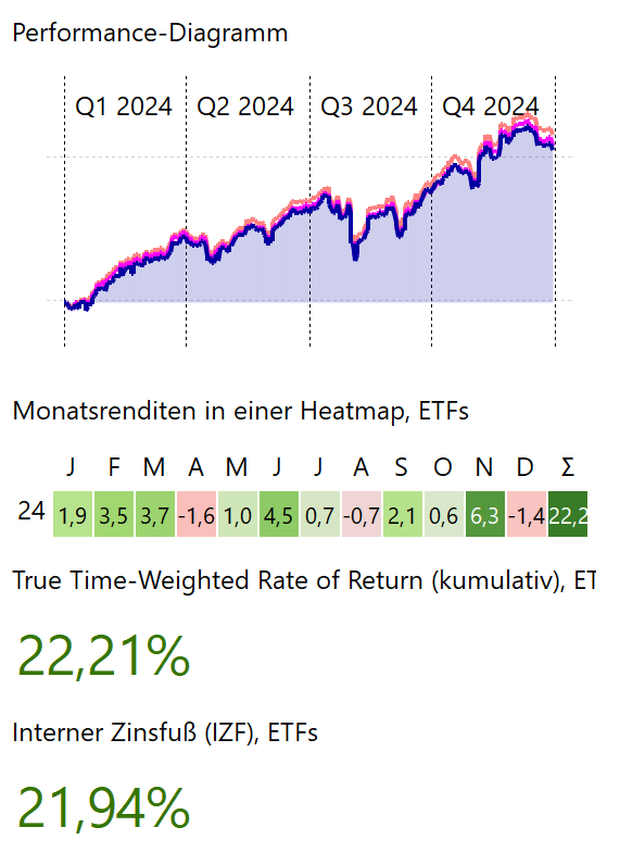 Gast250104 Dezember 31, 2024 · bearbeitet Januar 1, 2025 von DeWeMe Zitat 2024 Kursgewinne 20,88% + Dividenden 2,13% IZF 23,94% TTWROR 24,17% Bin zufrieden Da es letztes Jahr von Interesse war, anbei noch die Median Zahlen der Parqet Community 2024. Performance Depotwert Dividenden Dividenden Wachstum Neuinvestitionen Gezahlte Steuern Diesen Beitrag teilen Link zum Beitrag