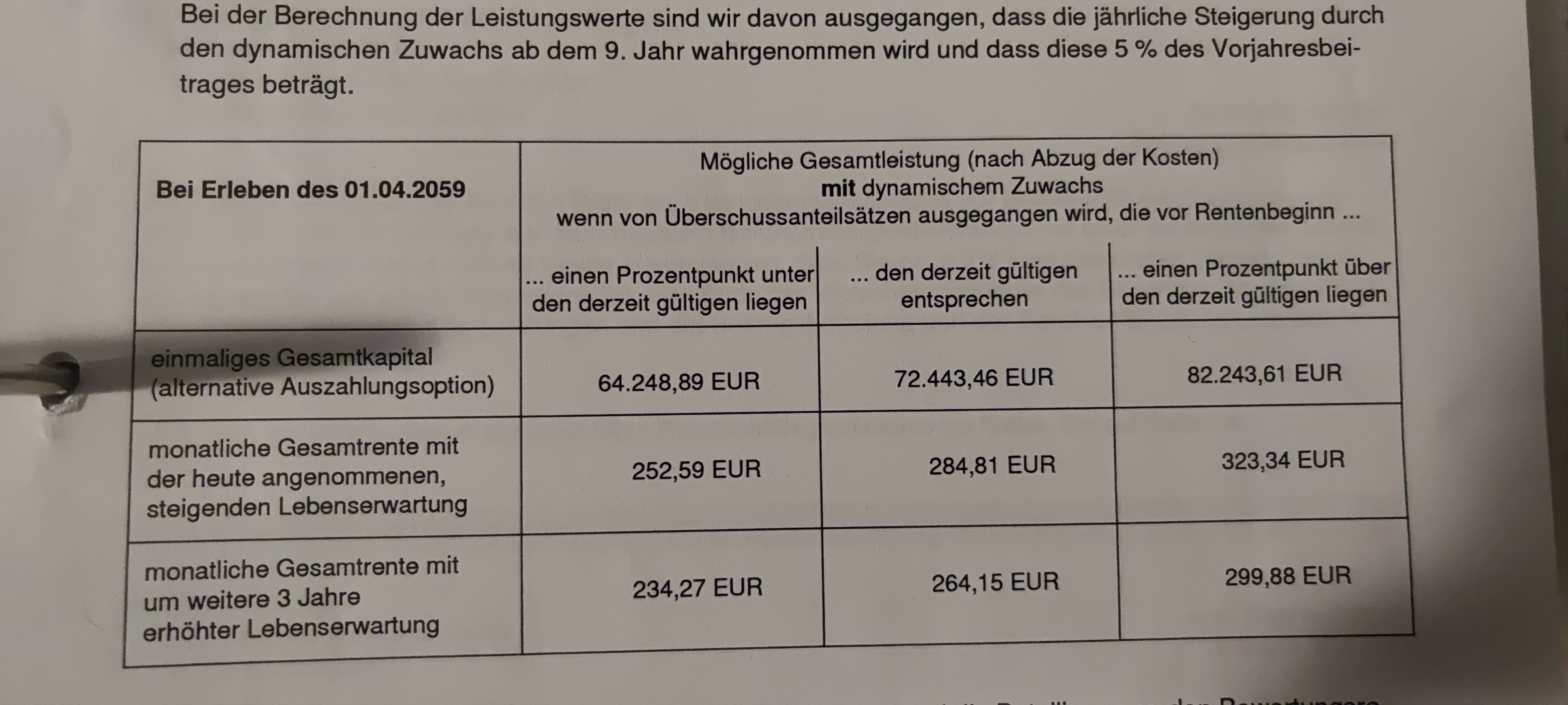 Das ist eine Arbeitsunfallversicherung die Geld zahlt wenn ich zu 50% behindert sein sollte. Wird das nicht in Anspruch genommen ist das Geld nicht weg da es dann als Zusatz Rente ausgezahlt wird. Werden mir da aber noch ein beratungstermin holen da fragen aufgekommen sind. Ich bin wie mein Name verrät 92er Baujahr, also 32 Jahre alt. Bei einer normalen Berufsunfähigkeit fand ich blöd dass das Geld dann weg ist wenn man nicht krank wird & in Rente geht. Bei dieser Versicherung zahle ich 37 Jahre. Falls ich berufsunfähig werde bekomme ich bis zum 31.03.2054 jeden Monat 700€. Wenn man aber sieht das ich z.b 2057 323,87€ pro Monat zahlen soll ist das schon heftig & ich wes nicht wenn meine Eltern sterben & ich Strom, Wasser etc selber zahlen muss ob ich dann die Versicherung überhaupt bezahlen kann. Mir kam schonmal der Gedanke ob eine einzelne berufsunfähigkeits Versicherung nicht billiger wäre. Ich werde sehen im Gespräch ob ich die Versicherung dann noch weiter nutze oder was ich mache.