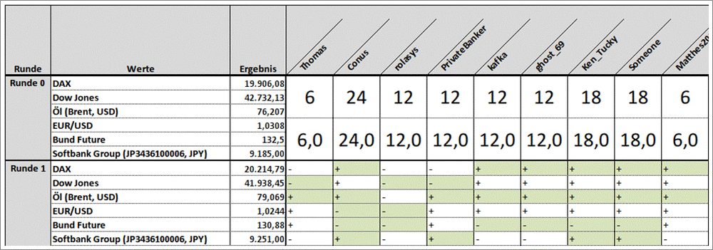 Thomas Januar 11, 2025 Hallo zusammen, eine weitere Börsenwettrunde beginnt. Viel Spaß beim Wetten. Tippabgabe bis Montag 17:00 Uhr --> 2. Runde von 11 Runden. Neue Startwerte und Veränderung aus der letzten Runde: 1. DAX: 20214,79 (+) 2. Dow Jones: 41938,45 (-) 3. Öl (Brent, USD): 79,069 (+) 4. EUR/USD: 1,0244 (-) 5. Bund Future: 130,88 (-) 6. Softbank Group (JP3436100006, JPY): 9251 (+) 6. (Neu) Zalando (DE000ZAL1111; EUR): 28,63 Informationen: Erst Tippabgabe! Danach können weitere Beiträge verfasst werden. Anders herum wird disqualifiziert! Die ersten 5 Werte stehen während der ganzen Tippsaison fest. Der 6. Wert wechselt von Runde zu Runde. Vorschläge für einen 6. Wert werden jederzeit entgegengenommen. Es dürfen jederzeit auch neue Spieler einsteigen und sich am laufenden Spiel beteiligen. Regeln: https://www.wertpapier-forum.de/topic/368-regeln-und-informationen-für-die-börsenwette/ Fragen: https://www.wertpapier-forum.de/topic/1420-fragen-zur-börsenwette-hier-rein/ Bitte die Tipps im vorgegebenen Format abgeben! So sieht der richtige Code als Beispiel aus: [hide ] (hier das Leerzeichen noch entfernen vor "]") 1. + 2. - 3. - 4. + 5. + 6. - [/hide] Mein Tipp: Versteckter Inhalt Du kannst den versteckten Inhalt sehen, sobald du auf dieses Thema antwortest. Diesen Beitrag teilen Link zum Beitrag