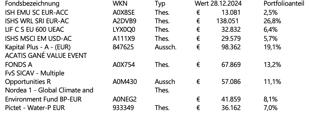 ursl 12. Januar Hallo zusammen! Ich bin dankbar und froh über die letzten Jahre hier viel lehrreiches und spannendes mitlesen können zu haben um den Einstieg in die (ETF) Geldanlage zu machen. Im Hinblick auf den Rentenstart in einigen Jahren möchte nun mein Depot entsprechend umschichten, vereinfachen, Kostenfallen zu umgehen und um ggf. fehlende Bereiche erweitern. Oberstes Ziel ist die Finanzierung der Rente für meinen Partner und mich; übriges Vermögen soll den Kindern/Enkeln langfristig zu Gute kommen. Historisch gibt es aus dem angesparten Vermögen und einem Erbe ein Portfolio empfohlen von einem ‘unabhängigen Anlageberater’ welcher v.a. aktive Fonds empfohlen hat. Zum Hintergrund 60 Jahre alt, leitende Angestellte im öffentlichen Bereich m. kaufmännsichem Hintergrund ich investiere seit 2020 in Fonds, seit 2021 mit verstärktem Interesse und Grundlagen in ETFs etc (Basis v.a. über Gerd Kommer, Manfred Weber Inhalte, das WPF, etc.) mit Anleihen habe ich mich bisher noch nicht ausreichend beschäftigt – sich in die Grundlagen einzulesen steht nun mit der Umstellung des Portfolios an. Meine Situation verheiratet, zwei Kinder Netto-Haushaltseinkommen ca. 7k € mtl., abbezahltes Eigenheim; monatliche Lebenshaltungskosten von c. 4k € mtl.; Sparrate c. 3k € mtl. geplanter Renteneintritt in 2030, geplante Lebenshaltungskosten von weiterhin c. 3-4k € mtl.; nach Abzug der Rende c. 2k € mtl./ 24k € jährlich Abbezahltes Eigenheim keine Verbindlichkeiten, Kredite, o.ä. kein Immobilienkauf geplant Vermögenswerte Vermögen ca. 550k € im Depot ca. 75k € Tagesgeld / Girokonto Kapitallebensversicherung, iHv ca 60k €, Sparrate mtl. 800€, Ende Vertragslaufzeit zum Renteneintritt - mein Mann hat als Selbstständiger nur einen geringfügingen Rentenanspruch, daher hier die Aufbesserung gesetzlicher Rentenanspruch, c. 1.650€ Schmuck / Gold, physisch, c. 50k € Als Notgroschen und für gelegentliche größere Konsumausfgaben will 25k € als Tagesgeld behalten und die restlichen 50k € erst einmal im Tagesgeld lassen und ggf. als Festgeld anlegen. Aktuelle Depotzusammensetzung Laufende Kosten Aktive Fonds: Kapital Plus A: 1,16%, Acatis Value Event: 1,8%, FvS 1,6%, Climate ETF 1,8%, Water ETF 2% ETFs: MSCI World 0.2%, Stoxx Europe 0.07%, MSCI EM 0.18%, EU Small Cap: 0,58%# Gesamt TER: 0.82% Erläuterungen Zunächst wurden mit einer Einmalanlage von c. 300k € (heutiger Wert) den Empfehlungen des Anlageberaters gefolgt und v.a. in aktive Fonds investiert (Kapital Plus A, Acatis Value Event, FvS Multiple oportunities R, Nordea climate, Pictet Water) Bei den Aktiven Fonds war ursprünglich der Gedanke eine breite Diversifikation sowie eine gute Gewichtung aus Aktien, Anleihen und alternativen Assets zu erreichen. Die Themenfonds (Climate, Water) haben einen großen Teil der Portfolioentwicklung getragen. Der Anlagezeitpunkt war im März 2021 während des Corona Crashs zufälligerweise recht günstig. In 2022 kamen zusätzlich die Anlage im Sinne eines ETF Weltportfolios iHv. ca. 220k € (heutiger Wert) hinzu. STOXX 600 sollte eine leichte Übergewichtung von Europa bewirken EMU SC war als Diversifikation angedacht; stand allerdings seit Anlage stehts unter Kursdruck Die Ausschüttenden Fonds erschöpfen den jährlichen Sparerpauschbetrag Alpha von -2.83 vgl. über die letzten drei Jahre klingt ernüchternd (-0.31 für 5J) Aktuelle Portfoliostruktur, gesamt (Morningstar X-Ray) C. 76% Aktien, 19% Anleihen, 5% Cash 38% Europa, 51% Amerika, 10% Asien (4.2% China, Japan 2.9% ) Anleihenstil: Medium-Short, Medium-Intermediate (50% staatlich, 30% Firmen; effektive Duration 4.62, Durchschnittliche Bonität A) Meine Überlegungen/Fragen Umschichtung hin zu risikoarmen Anteil für die Altersvorsorge Reduzierung der Aktienquote auf 40-50% zur Reduktion des Risikos für geplante Verkäufe ab 2029/2030 Die Überlegung hier ist v.a. den risikoarmen Anteil zu erhöhen. Hierzu würde es sich anbieten die teuren aktiven Fonds (Acatis Value, FvS) loszuwerden Ist die Annahme richtig dass sich hierfür v.a. ein entsprechender Bond ETF oder Staatsanleihen anbieten würden? Wie steht das im Vergleich zu Festgeld, gestaffelt über die nächsten Jahre? Wäre ein Umschichtung der gesamten aktiven Fonds hin zu ETFs zu diesem Zeitpunkt noch sinnvoll? Entgegenstehen hier v.a. die anfallenden Steuern auf Kapitalerträge Bei einem längeren Anlagehorizont des Gesamtportfolios wäre dies vermutlich eindeutig sinnvoll aufgrund der hohen Kosten aktiver Fonds, allerdings stehen in c. 5 Jahren ohnehin Verkäufe an über die der angesparte Steuervorteil weiterhin Rendite erwirtschaftet (absolut c. 32k €, KapSt v. ca 8k € bei Verkauf)? Der Aufbau des Portfolios wurde über die Jahre mit einem Mix aus der ursprünglichen Anlageempfehlung und einem späteren Einstieg in die Welt der passiven Portfolios vorgenommen. Ist der grundsätzliche Aufbau des Portfolios (unter berücksichtigung der angestrebten Umschichtungen) aus sicht der einschlägigen Meinung hier im Forum sinnvoll? Ich würde mich hier sehr über den Common sense check bzw. entsprechenden Anregungen freuen. Kerngedanke hier ist v.a. die Verteilung nach Regionen und ggf eine Vereinfachung des Portfolios (Keine weitere Anlage in EMU SC, Stoxx 600). Ich würde mich über Anregungen und Tipps und einen Austausch freuen, da man online einfach zu viele Meinugnen, oftmals für die Altersvorsorge nicht notwendigerweise passende, Infos findet. Danke schonmal für’s lesen! Viele Grüße Diesen Beitrag teilen Link zum Beitrag