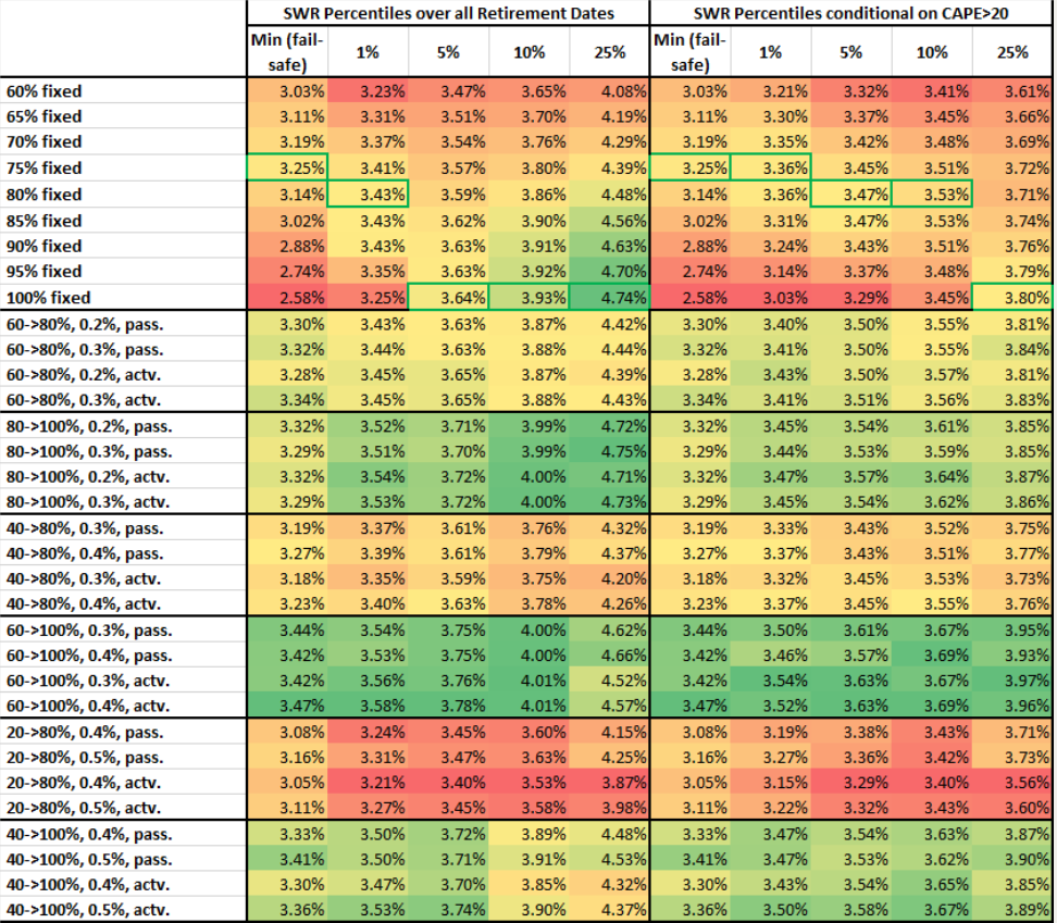 Lazaros 30. März vor 23 Minuten von Der Heini: Nicht hinterher, sondern bevor man in die Entnahmephase startet, kann man die SWR zu Beginn reduzieren, also statt 4% zum Beispiel eine leicht geringere nehmen. Auch hinterher ist die sichere Entnahmerate jährlich zu überprüfen. Überprüft werden muss, wie hoch die maximale Entnahmerate maximal sein darf, damit die Ziele verwirklicht werden können. Dabei kann sich die erwartete Restlebensdauer, das Vermögen und der Vermögensbedarf laufend ändern. Davon hängt dann die flexible SWR ab. Alles andere (z.B. 4% Entnahme inflationsangepasst, egal was passiert) wäre eine Beleidigung vernunftbegabter Wesen. So was wurde in sozialistischen Betonkopf-Planwirtschaften propagiert mit suboptimalen Erfolgsquoten. Diesen Beitrag teilen Link zum Beitrag
