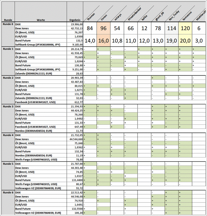 Thomas Februar 16, 2025 Hallo zusammen, eine weitere Börsenwettrunde beginnt. Viel Spaß beim Wetten. Tippabgabe bis Montag 17:00 Uhr --> 7. Runde von 11 Runden. Neue Startwerte und Veränderung aus der letzten Runde: 1. DAX: 22513,42 (+) 2. Dow Jones: 44546,08 (+) 3. Öl (Brent, USD): 74,91 (+) 4. EUR/USD: 1,0491 (+) 5. Bund Future: 132,55 (-) 6. Volkswagen VZ (DE0007664039, EUR): 100,2 (+) 6. (Neu) United Internet (DE0005089031, EUR): 15,15 Informationen: Erst Tippabgabe! Danach können weitere Beiträge verfasst werden. Anders herum wird disqualifiziert! Die ersten 5 Werte stehen während der ganzen Tippsaison fest. Der 6. Wert wechselt von Runde zu Runde. Vorschläge für einen 6. Wert werden jederzeit entgegengenommen. Es dürfen jederzeit auch neue Spieler einsteigen und sich am laufenden Spiel beteiligen. Regeln: https://www.wertpapier-forum.de/topic/368-regeln-und-informationen-für-die-börsenwette/ Fragen: https://www.wertpapier-forum.de/topic/1420-fragen-zur-börsenwette-hier-rein/ Bitte die Tipps im vorgegebenen Format abgeben! So sieht der richtige Code als Beispiel aus: [hide ] (hier das Leerzeichen noch entfernen vor "]") 1. + 2. - 3. - 4. + 5. + 6. - [/hide] Mein Tipp: Versteckter Inhalt Du kannst den versteckten Inhalt sehen, sobald du auf dieses Thema antwortest. Diesen Beitrag teilen Link zum Beitrag