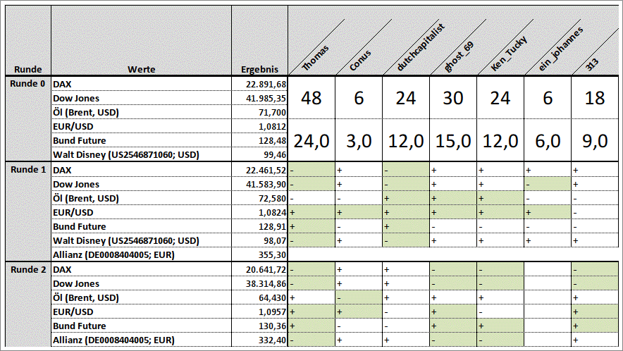 Thomas 4. April Hallo zusammen, eine weitere Börsenwettrunde beginnt. Viel Spaß beim Wetten. Tippabgabe bis Montag 17:00 Uhr --> 3. Runde von 11 Runden. Neue Startwerte und Veränderung aus der letzten Runde: 1. DAX: 20641,72 (-) 2. Dow Jones: 38314,86 (-) 3. Öl (Brent, USD): 64,43 (-) 4. EUR/USD: 1,0957 (+) 5. Bund Future: 130,36 (+) 6. Allianz (DE0008404005; EUR): 332,4 (-) 6. (Neu) AMD (US0079031078; USD): 85,76 Informationen: Erst Tippabgabe! Danach können weitere Beiträge verfasst werden. Anders herum wird disqualifiziert! Die ersten 5 Werte stehen während der ganzen Tippsaison fest. Der 6. Wert wechselt von Runde zu Runde. Vorschläge für einen 6. Wert werden jederzeit entgegengenommen. Es dürfen jederzeit auch neue Spieler einsteigen und sich am laufenden Spiel beteiligen. Regeln: https://www.wertpapier-forum.de/topic/368-regeln-und-informationen-für-die-börsenwette/ Fragen: https://www.wertpapier-forum.de/topic/1420-fragen-zur-börsenwette-hier-rein/ Bitte die Tipps im vorgegebenen Format abgeben! So sieht der richtige Code als Beispiel aus: [hide ] (hier das Leerzeichen noch entfernen vor "]") 1. + 2. - 3. - 4. + 5. + 6. - [/hide] Ganz schön wilde Zeit, aber ich bin der Meinung das ist nur der Anfang. Mein Tipp: Versteckter Inhalt Du kannst den versteckten Inhalt sehen, sobald du auf dieses Thema antwortest. Diesen Beitrag teilen Link zum Beitrag