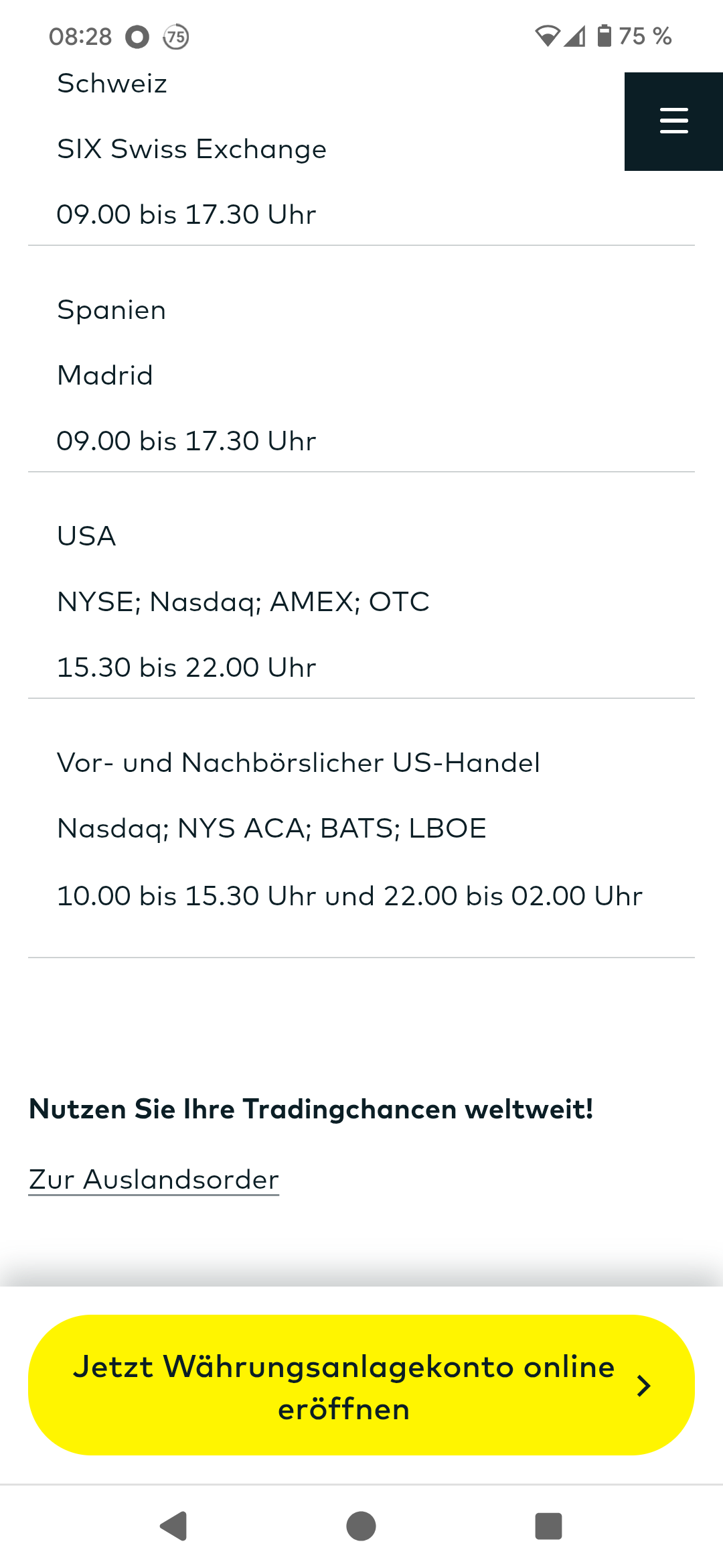 Ramstein April 14, 2025 vor 24 Minuten von Rudi_40: Ich möchte aber auch von 14:00 - 15:30 an der NASDAQ handeln können. Weiss jemand welcher Broker / Bank das anbietet? Und ich möchte zwischen 4:00 und 6:00 Uhr an der Börse Frankfurt handeln. Diesen Beitrag teilen Link zum Beitrag