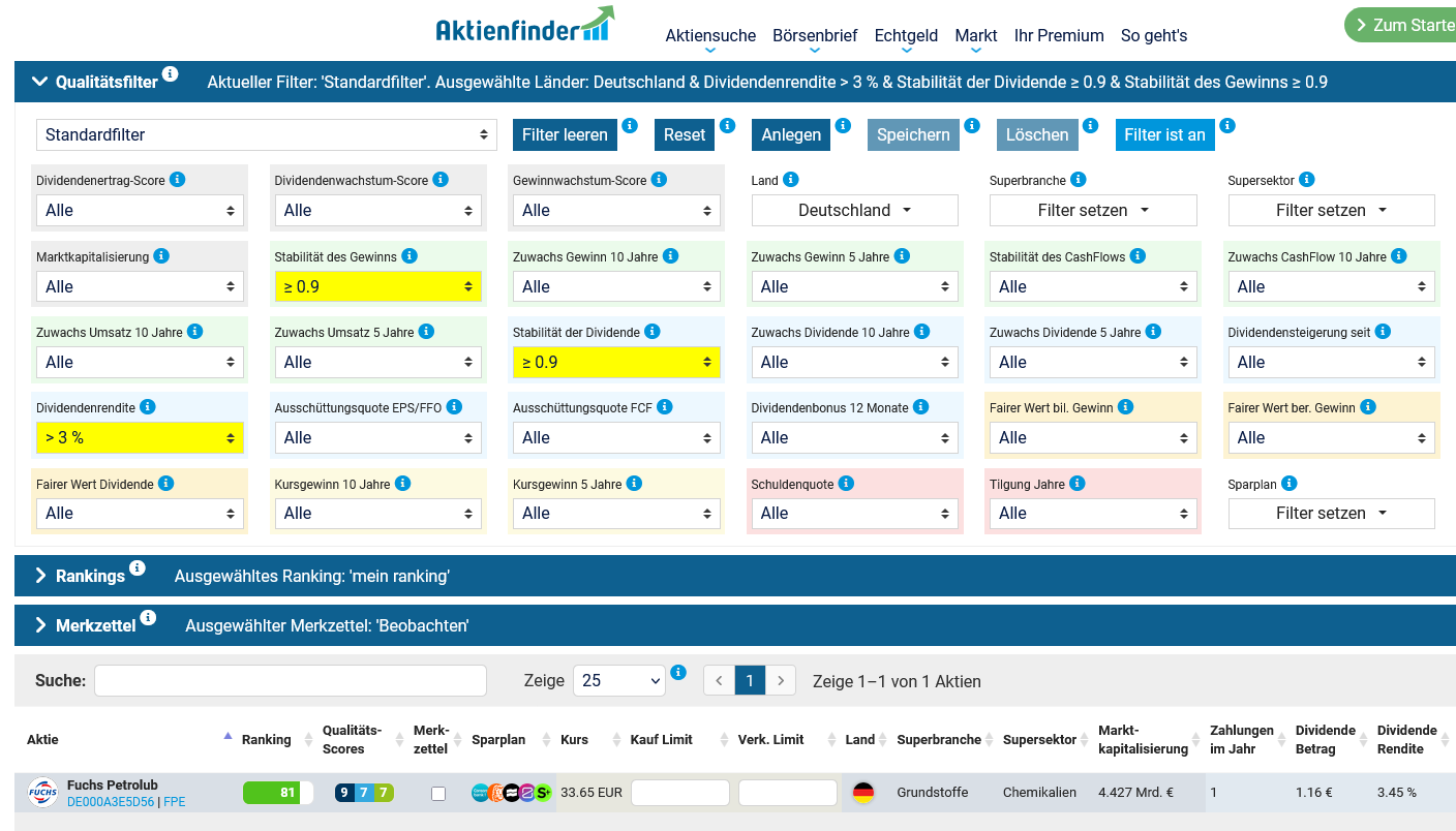Al Bundy 28. Mai vor 2 Stunden von Lazaros: Damit wird der Auswahltopf immer kleiner: 1. Mindestens 3% Dividende, 2. jährliche Dividendensteigerung, 3. jährliches Gewinnwachstum, 4. Deutschland. Gebe ich diese Kriterien in den Aktienfinder ein, bleibt von 273 deutschen Aktien nur eine einzige übrig: Diesen Beitrag teilen Link zum Beitrag