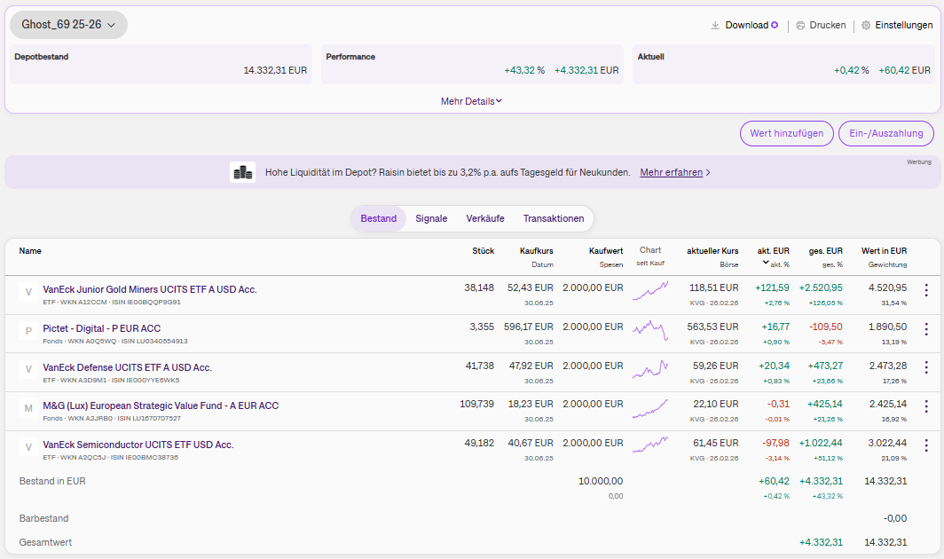 Schlumich Dezember 31, 2025 Stand Ende 2025: + 12,23% 01. Zonk4711 +17,57% 02. Schlumich +12,23% 03. Schildkröte +10,95% 04. TheBit +9,51% 05. paulpanther + 8,17% Diesen Beitrag teilen Link zum Beitrag