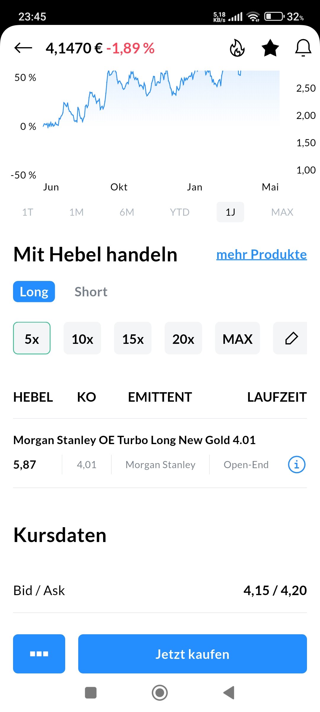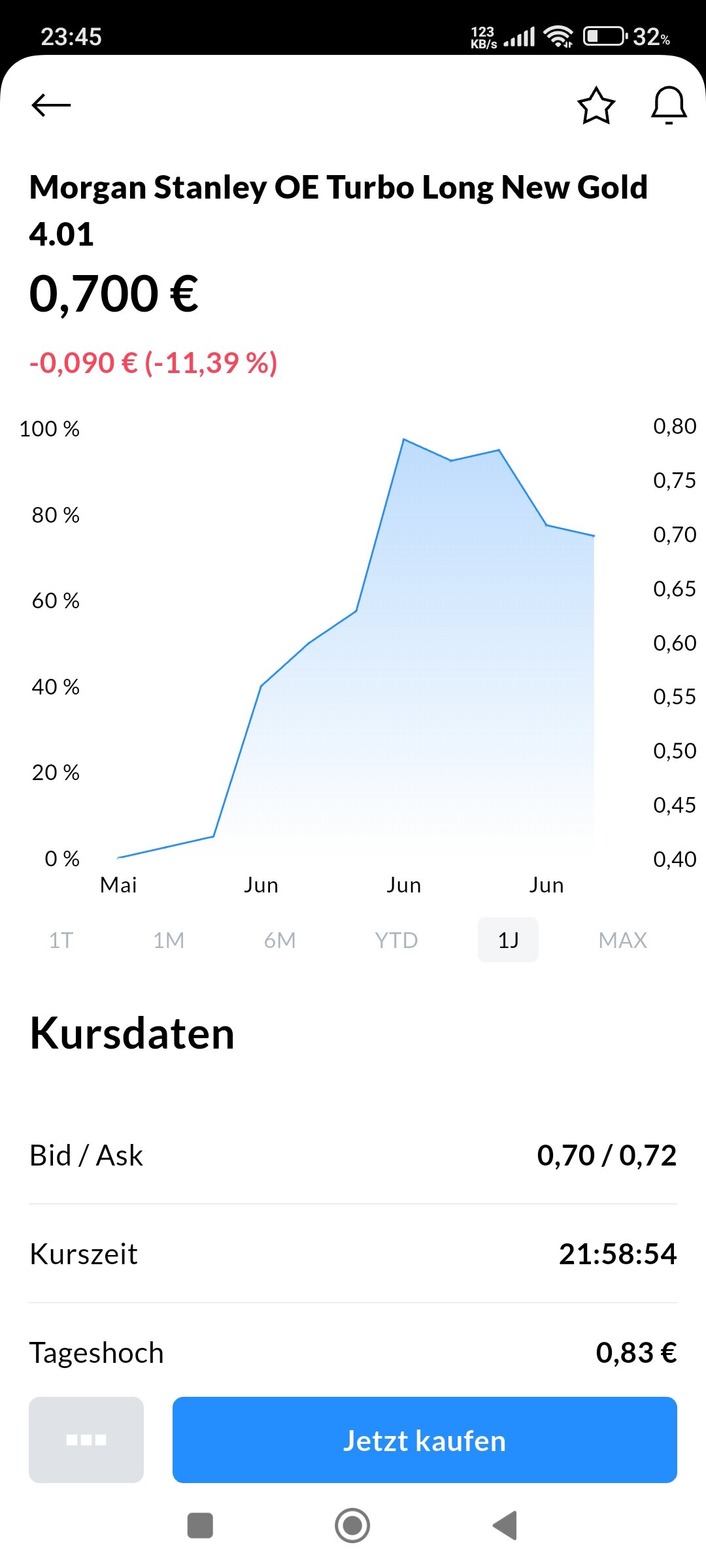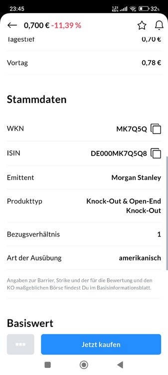 Malvolio Juni 11, 2025 · bearbeitet Juni 11, 2025 von Malvolio Du musst erstmal verstehen, wie das Produkt was du ggf. kaufen möchtest funktioniert .... ganz unabhängig von Deinem Broker. Der erste Schritt ist dabei, auf die Seite des Emittenten .... in diesem Falle Morgan Stanley ... zu gehen, und Dir die dort vorhandenen Informationen anzuschauen. Dort findest Du alle Einzelheiten und Bedingungen zu dem Produkt und auch Informationsblätter und erklärende Broschüren (siehe unter "Produktwissen" und "Dokumente"). Die musst Du Dir erstmal gut durchlesen. Dort werden sicher auch Begriffe wie Bezugsverhältnis, Long und Short und Knock-Out-Schwelle erklärt .... und auch was für Kosten und Risiken (!) in solchen Sachen stecken. DE000MK7Q5Q8 | MK7Q5Q | Turbo Open End | Long | New Gold | 4,0137 | Morgan Stanley https://zertifikate.morganstanley.com/produktdetails/de000mk7q5q8 Diesen Beitrag teilen Link zum Beitrag